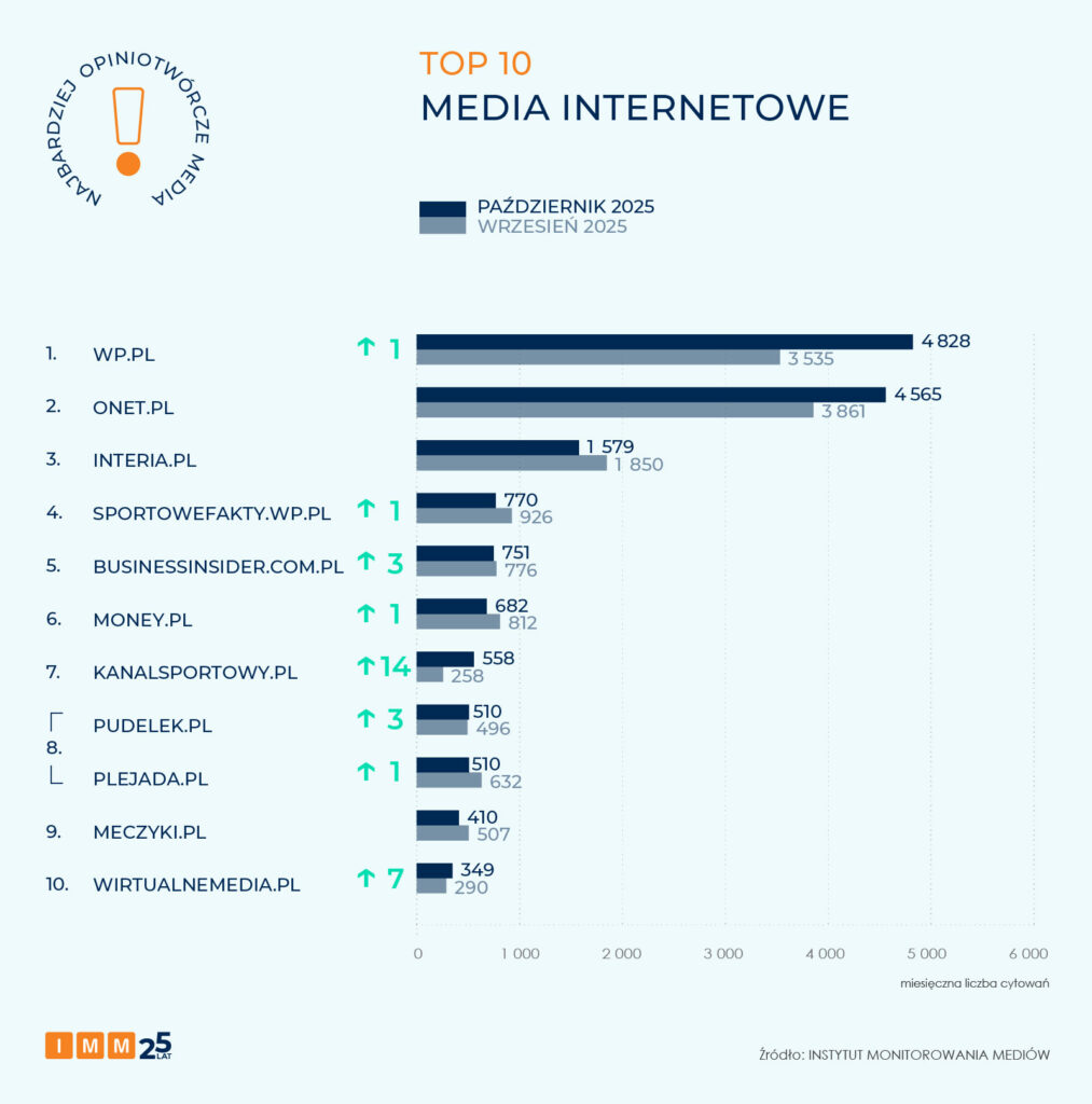 Pierwsze miejsce w zestawieniu IMM najbardziej opiniotwórczych portali października zajęła Wirtualna Polska z ponad 4,8 tys. powołań na źródło. Na drugim miejscu uplasował się Onet z ponad 4,6 tys. cytowaniami.