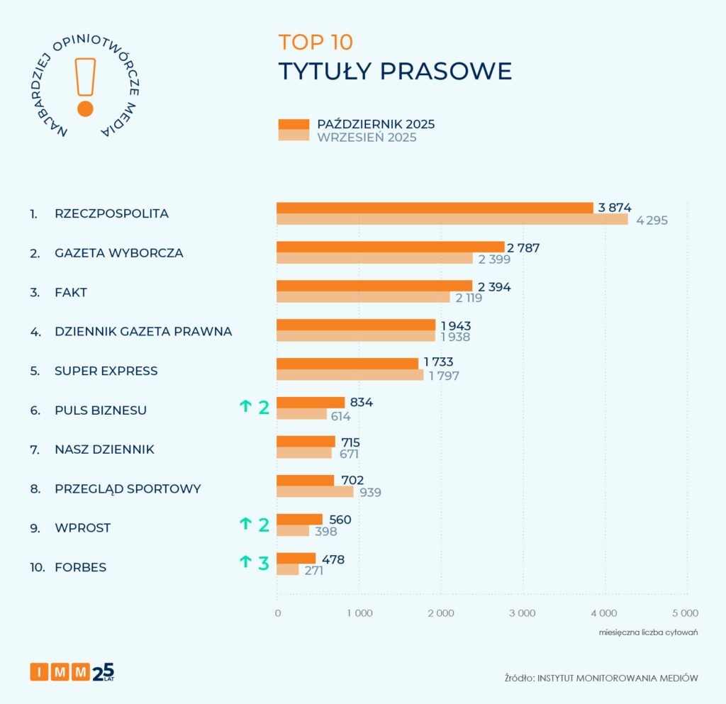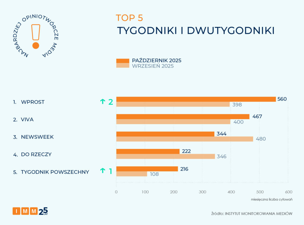 Podium najbardziej opiniotwórczych tygodników i dwutygodników otwiera „Wprost” (awans o 2 pozycje), zdobywając w październiku 560 powołań na źródło m.in. dzięki rozmowie z prezydentem Nawrockim, w której opowiedział m.in. o podpisaniu ustawy o pomocy Ukraińcom.