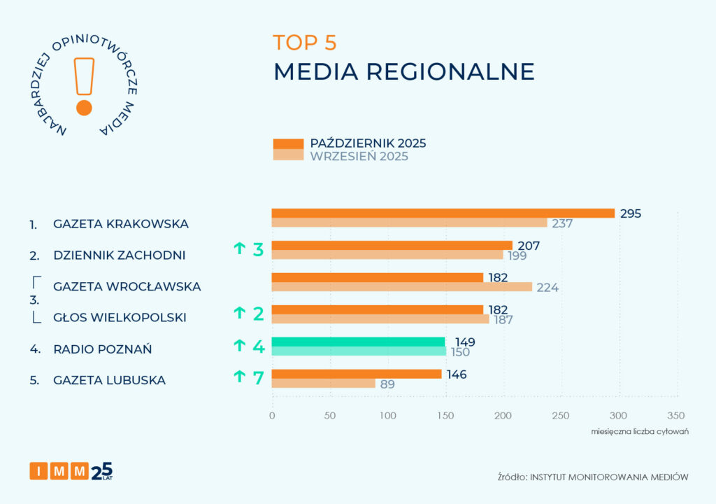 Zestawienie IMM najbardziej opiniotwórczych mediów regionalnych października otwiera „Gazeta Krakowska” (295 cytowań). Dziennik informował o zmianach na stanowisku trenera Wieczystej Kraków.
