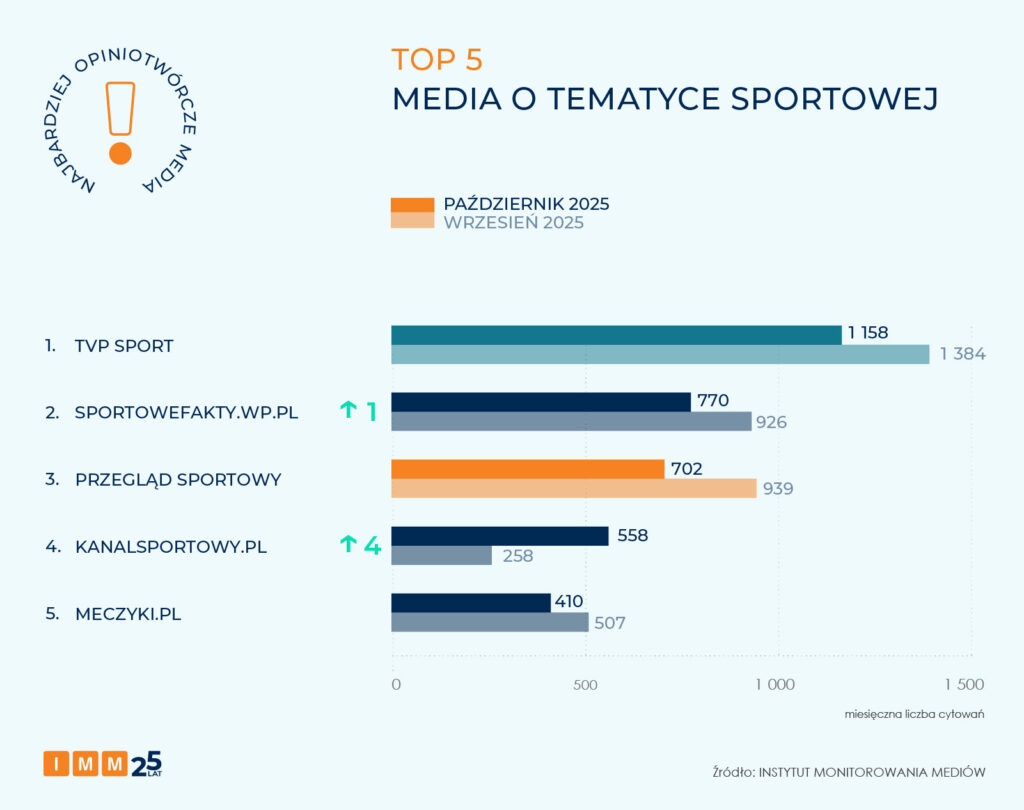 Najbardziej opiniotwórczym medium o tematyce sportowej w październiku został TVP Sport, który osiągnął wynik blisko 1,2 tys. powołań w innych mediach.