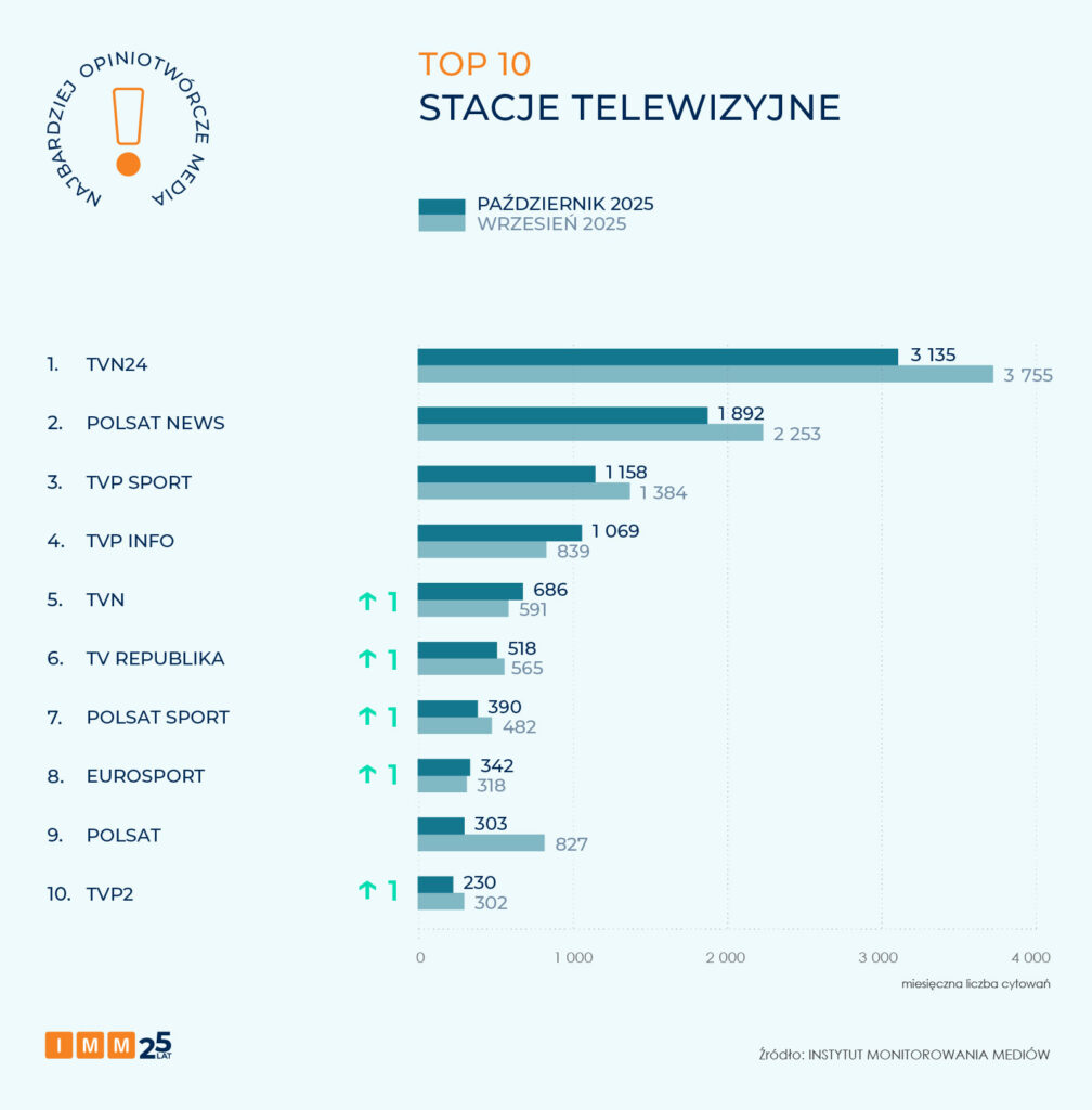 Najbardziej opiniotwórczą stacją października, osiągając wynik ponad 3,1 tys. cytowań i awansując o jedną pozycję, został TVN24. Stacja, powołując się na nieoficjalne informacje, informowała o objęciu przez byłą Pierwszą Damę Agatę Kornhauser-Dudę stanowiska doradczyni prezesa Narodowego Banku Polskiego.