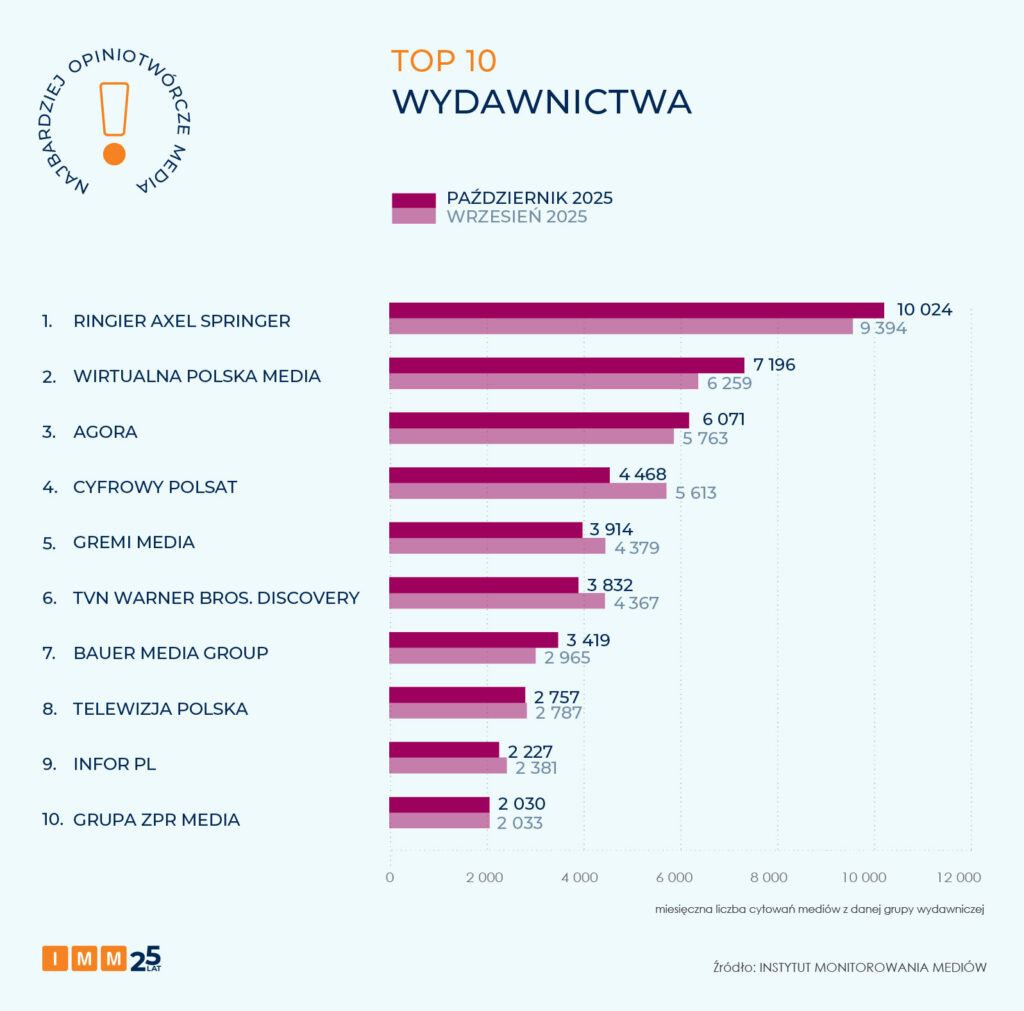 Pierwsze miejsce wśród najbardziej opiniotwórczych wydawnictw października utrzymuje Ringier Axel Springer Polska, którego redakcje Business Insider, „Fakt”, „Forbes”, Medonet, „Newsweek”, Noizz, Onet, Plejada i „Przegląd Sportowy” były cytowane przez dziennikarzy innych mediów w Polsce ponad 10 tys. razy.