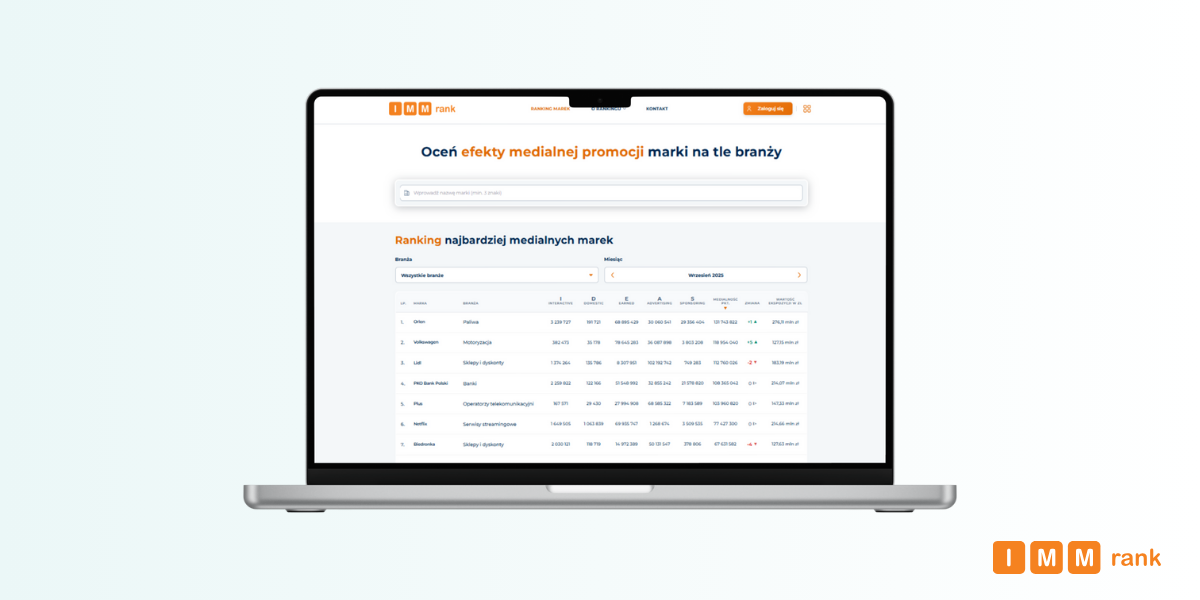 Od grudnia 2025 r. IMMrank będzie co miesiąc uzupełniany o kolejne sektory oraz branże obecne na polskim rynku. Każdy użytkownik może po zalogowaniu uzyskać dostęp do szczegółowych danych wskaźnikowych i pozycji dowolnie wybranej marki w otoczeniu dziewięciu najbardziej medialnych konkurentów branżowych w wybranym miesiącu.