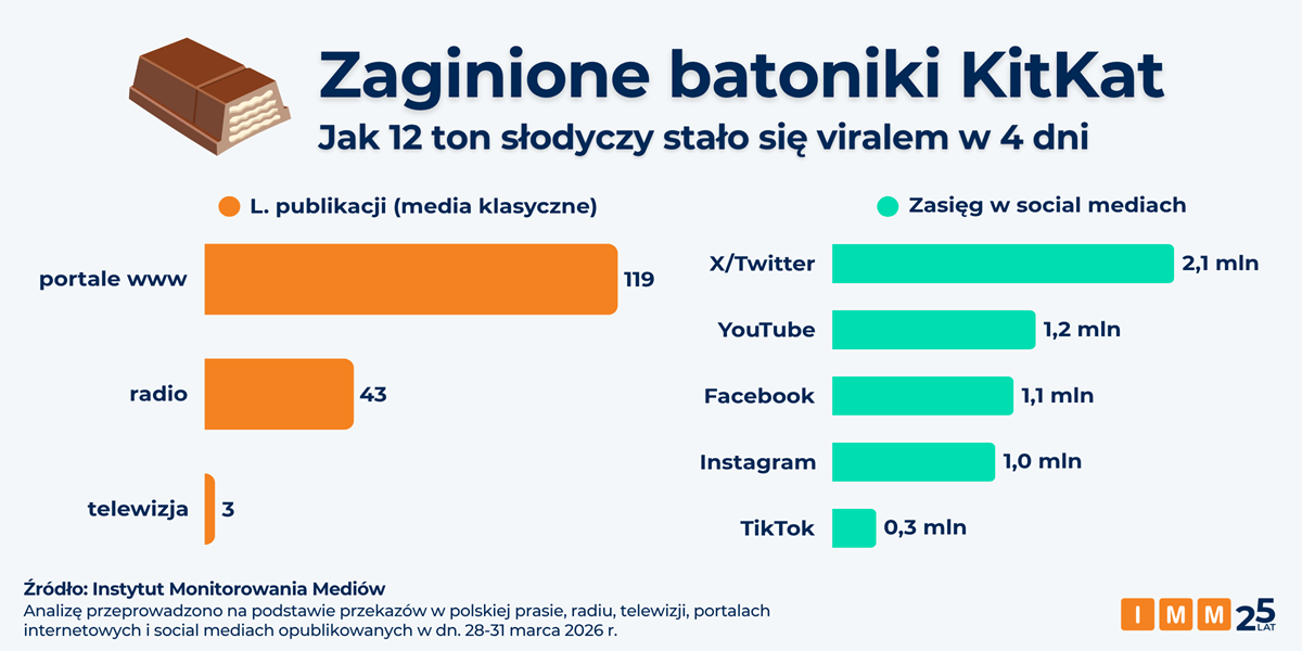 Ponad 400 tys. czekoladek marki KitKat zaginęło podczas transportu na trasie z Włoch do Polski. Jak opisuje PRoto.pl, Nestlé zamiast standardowego, chłodnego komunikatu o kryzysie logistycznym, postanowiło podejść do sprawy z dystansem. W efekcie sytuacja szybko stała się internetowym viralem – do dyskusji włączyły się inne marki, tworząc własne „oficjalne oświadczenia”. Według analizy Instytutu Monitorowania Mediów (IMM) przygotowanej dla portalu PRoto.pl w zaledwie cztery dni w mediach klasycznych i społecznościowych sprawa uzyskała zasięg ponad 7,7 mln.