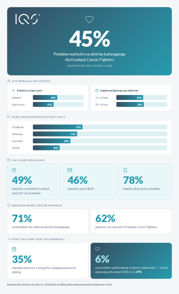 *Źródło: Badanie Omnisurv by IQS, 27–29.04.2026, N=1000, próba reprezentatywna Polaków, którzy słyszeli o akcji Łatwoganga w wieku 16-65 lat.