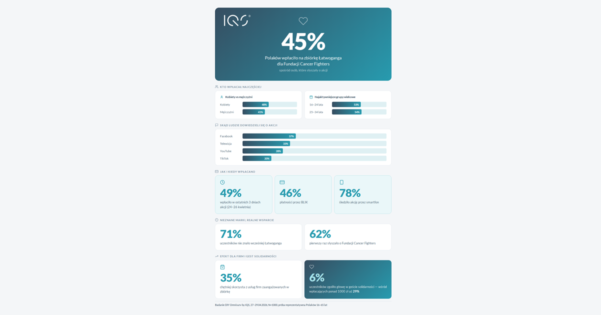Kończy się era fasadowego CSR-u, a zaczyna czas realnego zaangażowania opartego na autentyczności. Aż 53% badanych pozytywnie oceniło obecność marek takich jak InPost, Tymbark czy WK Dzik w akcji Łatwoganga, widząc w tym szczerą i autentyczną chęć pomocy, a nie tylko chłodną kalkulację marketingową. Dla biznesu to jasny sygnał: konsumenci potrafią nagrodzić zaufaniem te marki, które potrafią organicznie i bez zadęcia wejść w świat twórców internetowych. Z perspektywy badawczej to fascynujący dowód na to, jak umiejętnie dobrany kontekst charytatywny buduje kapitał marki u cyfrowego konsumenta – komentuje Przemysław Kuraczyk, Business Growth Director w IQS.