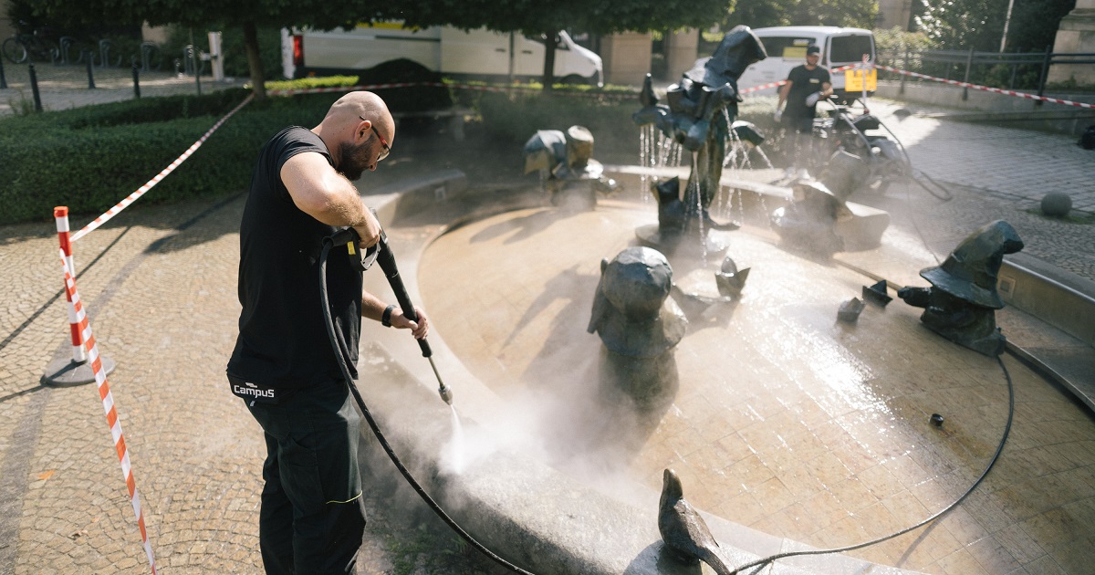 Ekipa Kärcher zajęła się czyszczeniem krasnali a także innymi perłami architektury i sztuki Wrocławia jak pomnikiem Bolesława Chrobrego, rzeźbą Arlekina i fontanny przy Teatrze Lalek.
