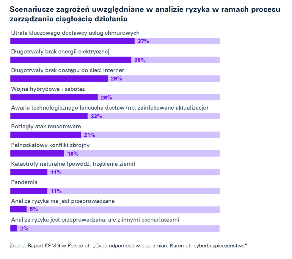 Zakres scenariuszy zagrożeń uwzględnianych w analizach ryzyka w ramach zarządzania ciągłością działania pokazuje, na ile organizacje przygotowują się na zdarzenia o charakterze systemowym i długotrwałym. Scenariuszami zagrożeń najczęściej wskazywanymi w analizie ryzyka są: utrata kluczowego dostawcy usług chmurowych (37%) oraz długotrwały brak energii elektrycznej (36%). 29% ankietowanych firm wśród scenariuszy zagrożeń uwzględnia długotrwały brak dostępu do Internetu. Jednocześnie już co czwarty ankietowany (26%) zwraca uwagę na wojnę hybrydową i sabotaż. Kolejnymi zagrożeniami uwzględnianymi w firmowych analizach ryzyka są awarie technologicznego łańcucha dostaw, np. zainfekowane aktualizacje (23%), rozległy atak ransomware (21%), a 16% ankietowanych bierze pod uwagę również ryzyko pełnoskalowego konfliktu zbrojnego.