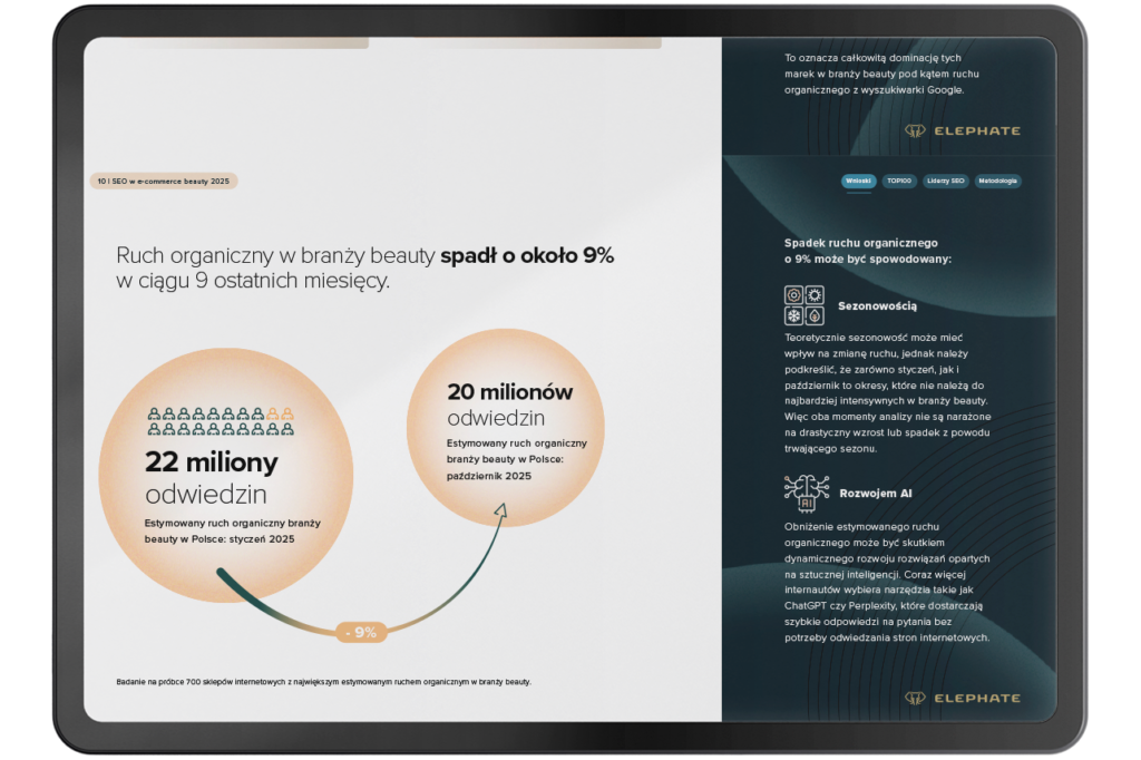 Najnowszy raport Elephate pokazuje czarno na białym, że rynek beauty nie tylko dojrzewa, ale wręcz dynamicznie się przeobraża, a wygrywać będą ci, którzy zrozumieją te zmiany szybciej niż konkurencja. Oto kluczowe wnioski z raportu „SEO w e-commerce beauty 2025”.