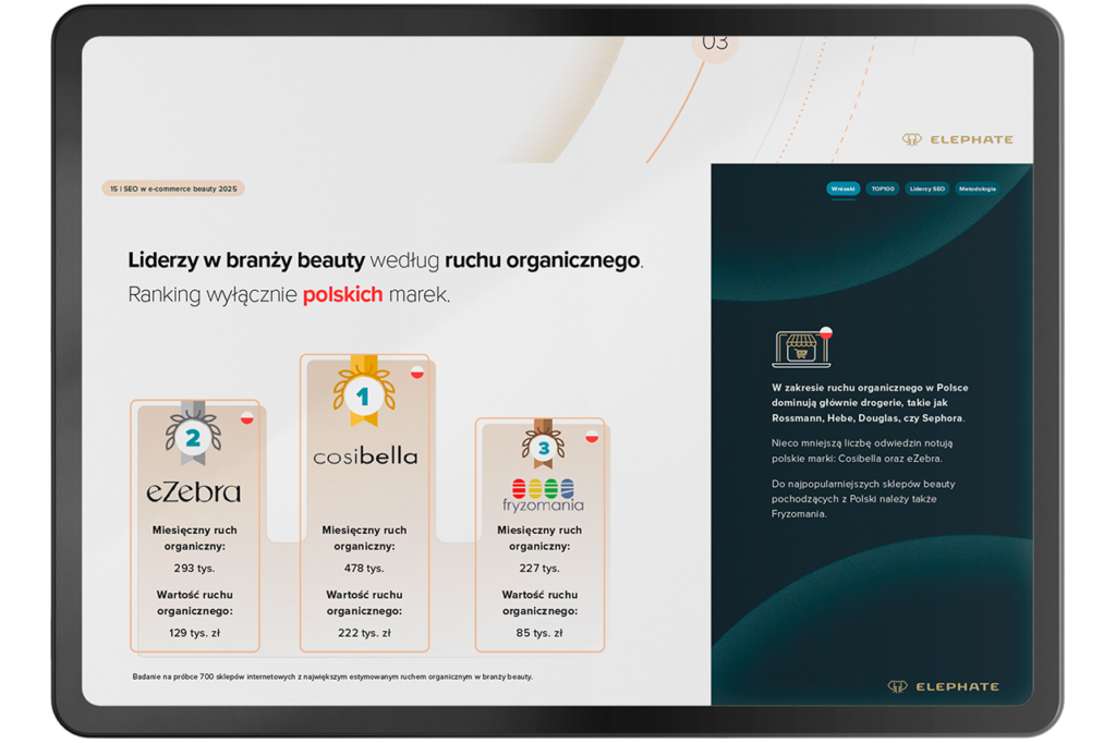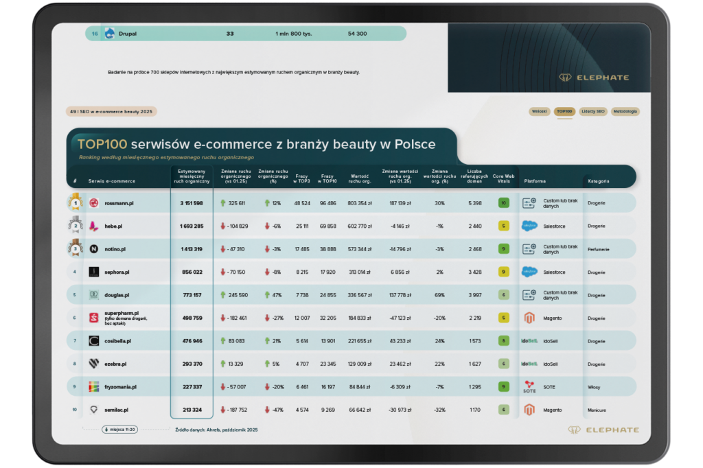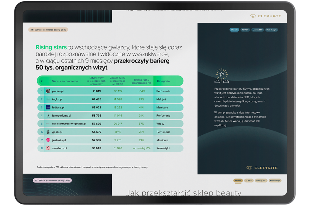 Tegoroczne zestawienie TOP100 pokazuje wyraźne przetasowania w branży. W czołówce nadal znajdują się rozpoznawalne marki, takie jak Notino, Cosibella, eZebra czy Fryzomania, które konsekwentnie budują widoczność dzięki szerokiemu asortymentowi i stabilnym strategiom SEO. Jednocześnie raport podkreśla dynamiczne wzrosty nowych lub szybciej adaptujących się graczy, jak Made In Lab czy Flaconi, którym udało się zwiększyć ruch organiczny nawet o ponad 100%.
