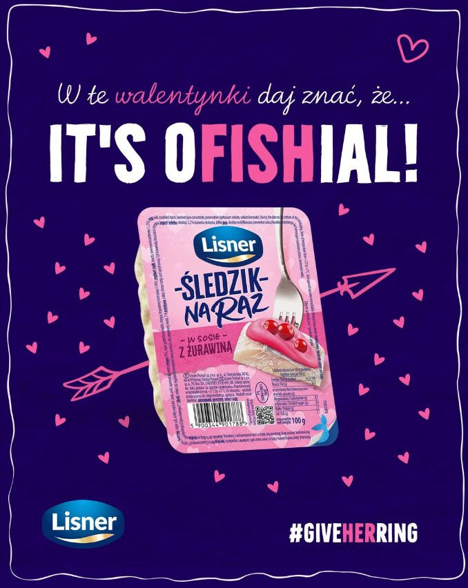 Na koniec zostawiłam markę, która teoretycznie pasuje do walentynek jak przysłowiowa pięść do nosa – czyli Lisner. Śledzie to produkt z kategorii tych „nieoczywistych” w kontekście romantycznej kolacji, ale to właśnie ten kontrast stał się ich największą siłą. Marka po mistrzowsku wykorzystała zabawę słowem, wprowadzając neologizm „oFISHial”, który w social mediach stał się motywem przewodnim kampanii.