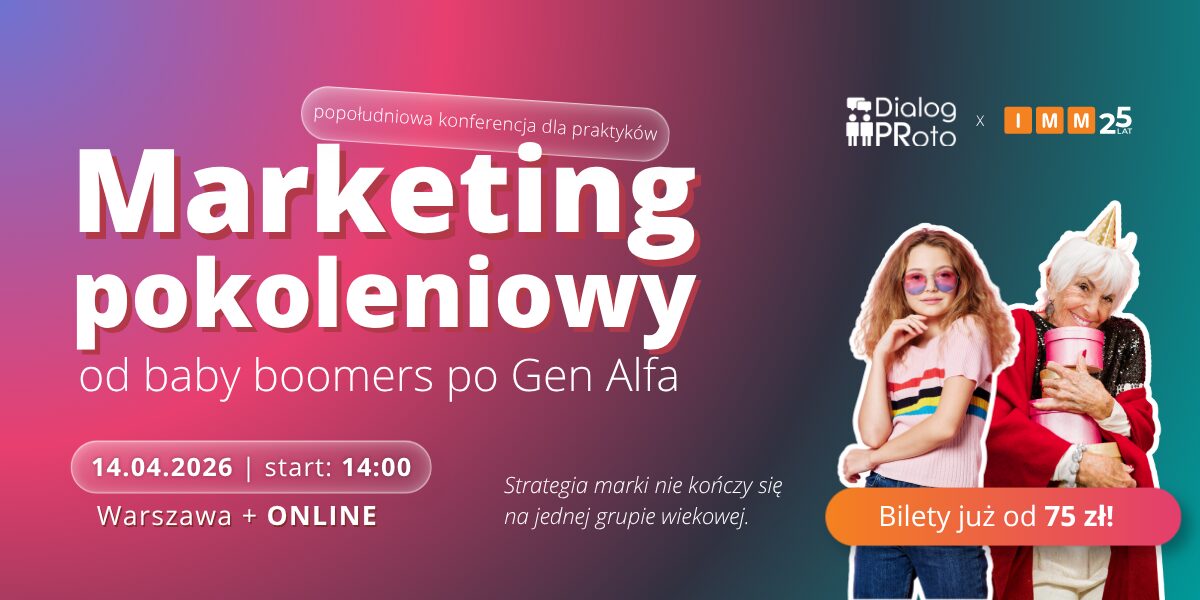 Już 14 kwietnia w Warszawie odbędzie się kolejna edycja Dialogu PRoto x IMM. Tym razem wydarzenie poświęcone będzie marketingowi pokoleniowemu – od baby boomersów pod Gen Alfa. To obowiązkowy punkt w kalendarzu marketerów i PR-owców, którzy chcą wyjść poza schematyczne myślenie o generacjach. W programie m.in. prelekcja na temat podziałów na pokolenia i błędów w segmentacji, analiza medialna emocji i nastrojów pięciu generacji oraz panel dyskusyjny liderów branży.