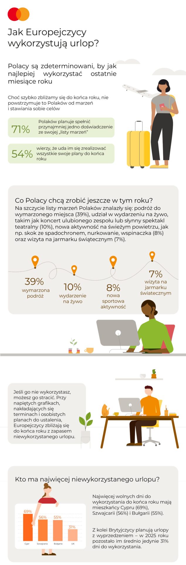Badanie Mastercard przeprowadzone wśród ponad 20 000 respondentów z całej Europy pokazuje, że prawie połowa Polaków (47%) miała w październiku do dyspozycji jeszcze od 7 do ponad 20 dni urlopu – najczęściej między 7 a 10 dni (20%). To szansa, by zrealizować długo odkładane plany.