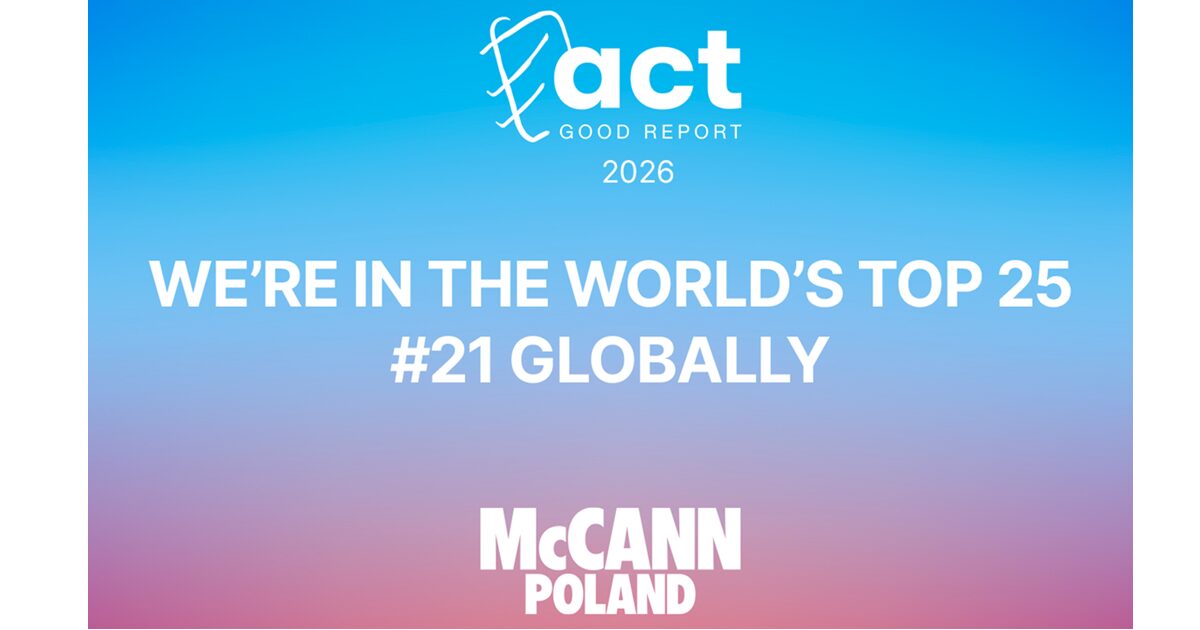 McCANN Poland po raz trzeci z rzędu znalazł się w gronie 25 najlepszych agencji na świecie. W tegorocznej edycji ACT Good Report 2026 – jednego z najważniejszych globalnych zestawień wyróżniających kreatywność, która realnie wpływa na świat, McCANN Poland zajął 21. miejsce globalnie, umacniając swoją pozycję w międzynarodowej czołówce.