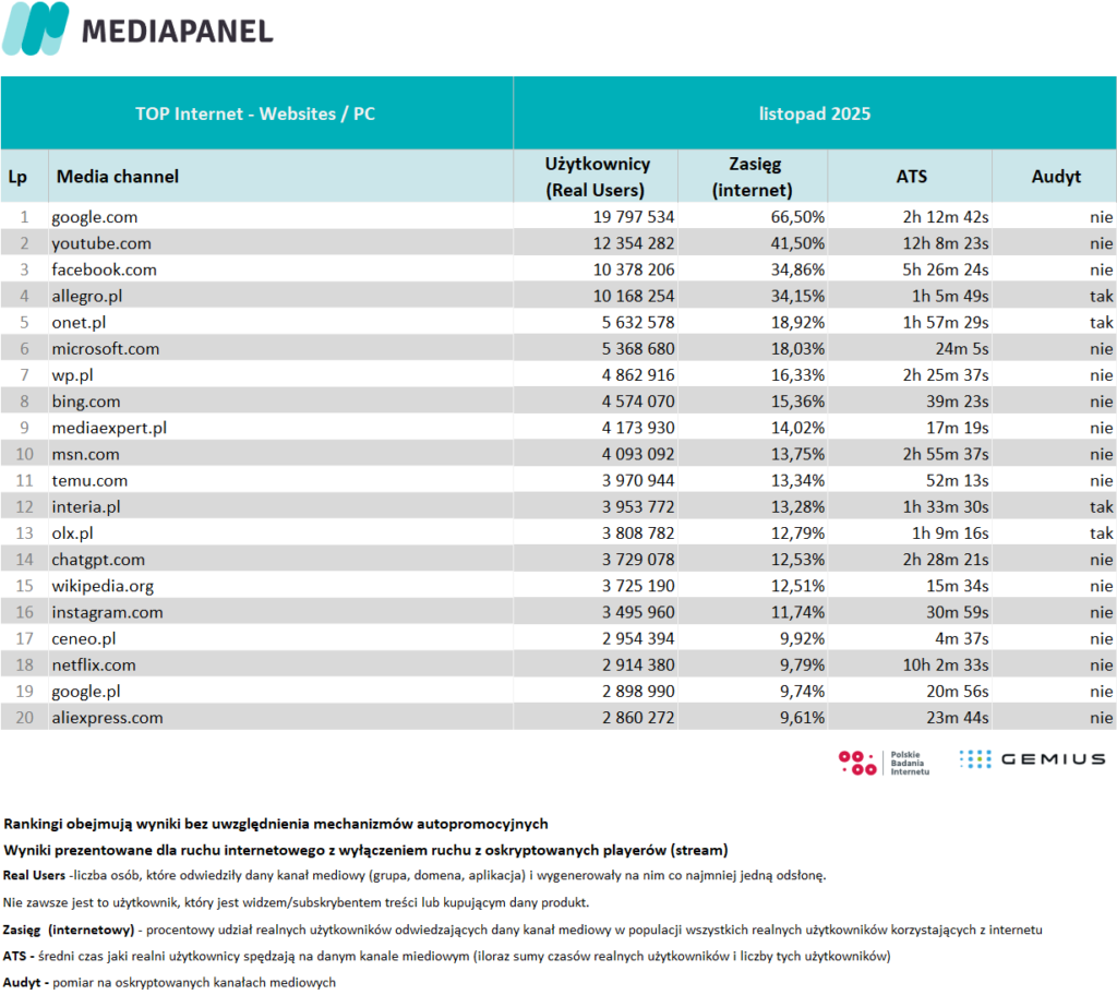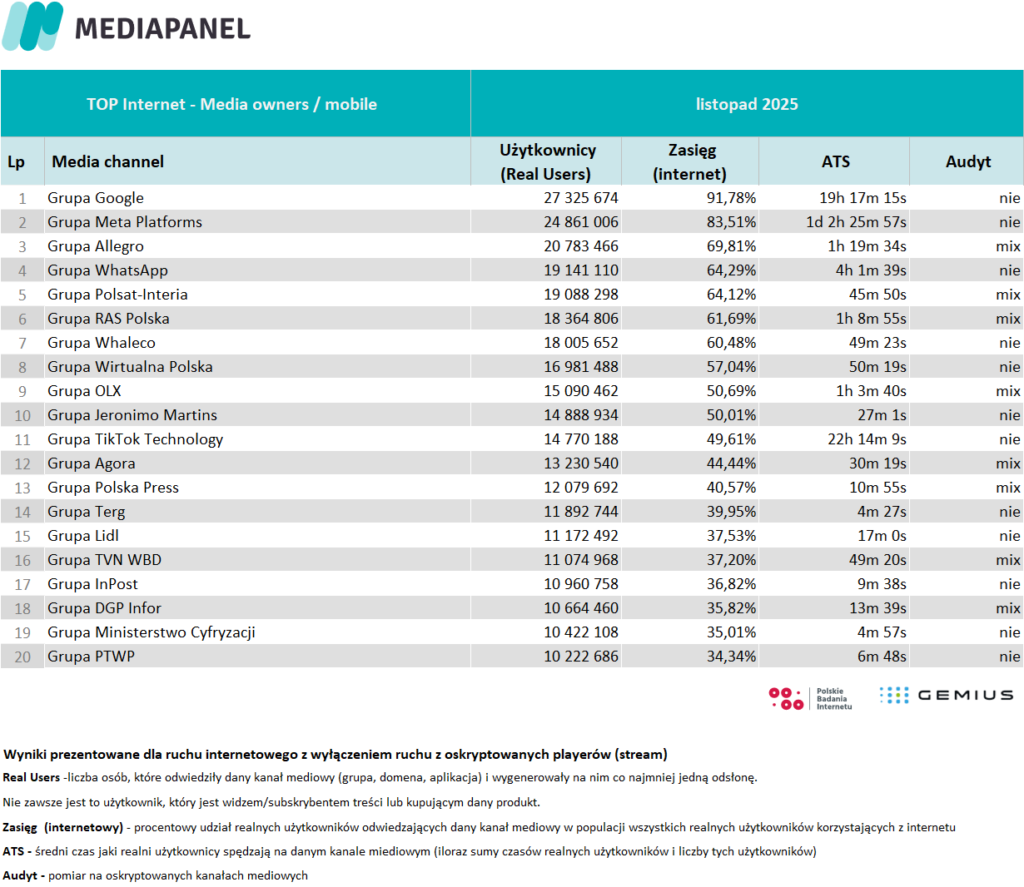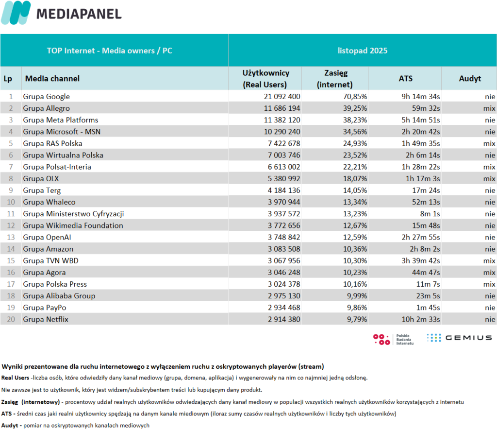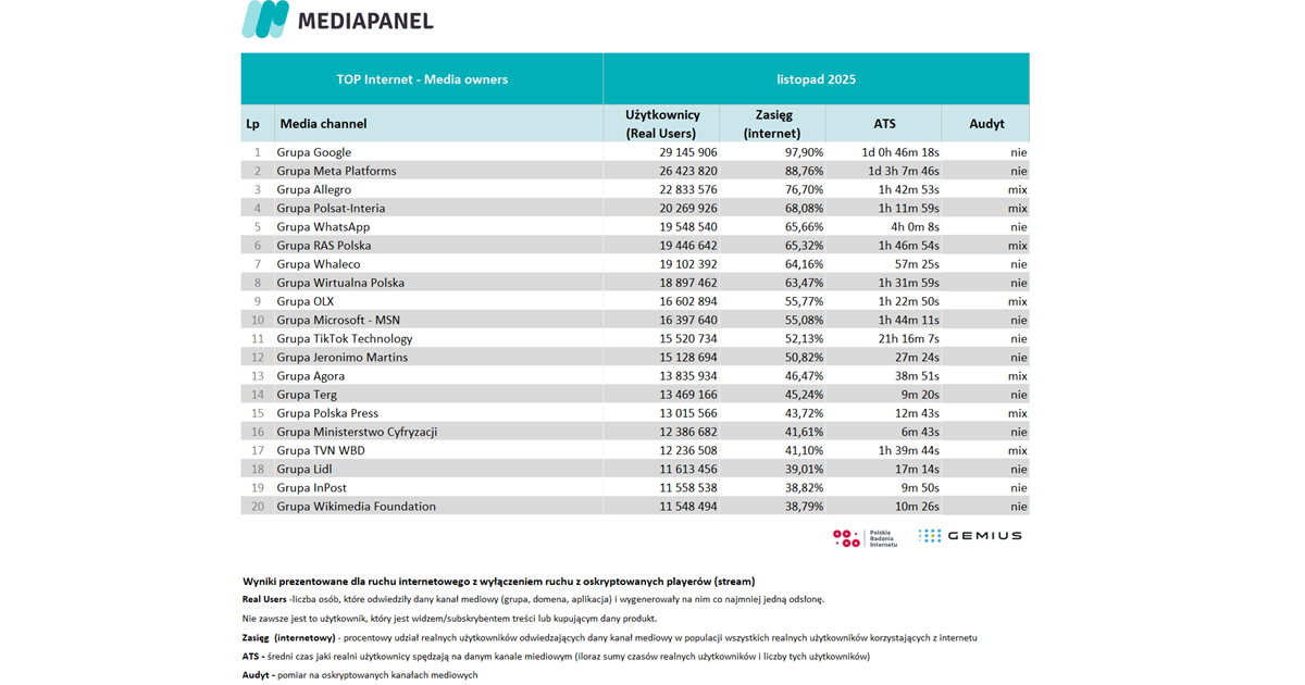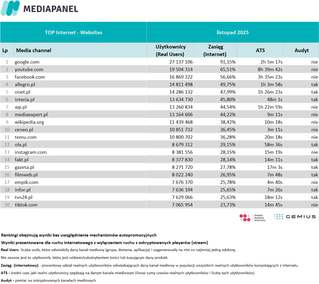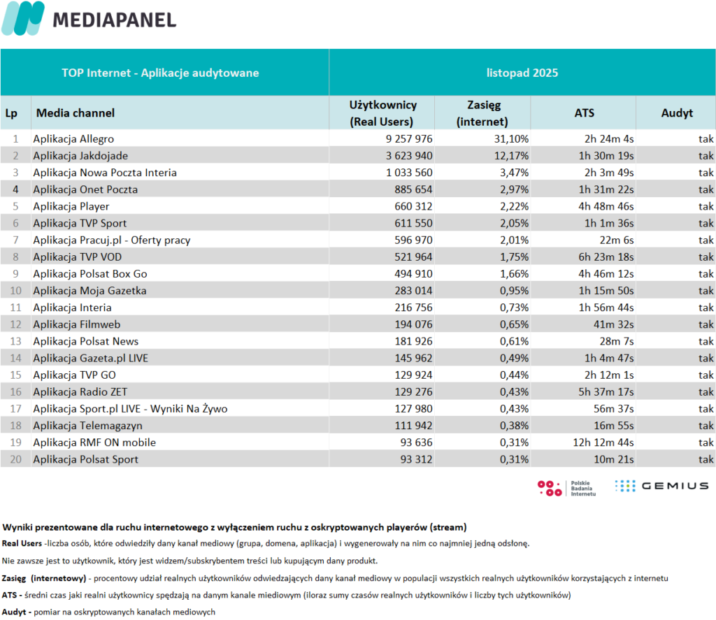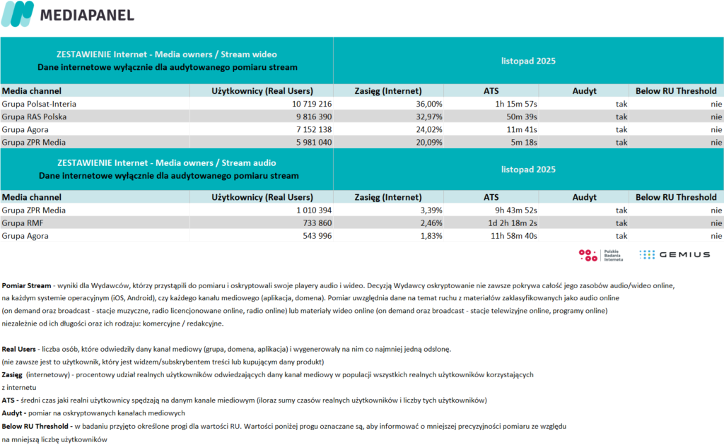 Poniżej zaprezentowane zostały szczegółowe zagregowane miesięczne dane pochodzące z badania internetu: rankingi wydawców i witryn internetowych oraz aplikacji. Zaprezentowano również zestawienie audytowanych playerów audio i wideo – ich wyniki pokazano w agregacji do grup mediowych, biorących udział w badaniu.