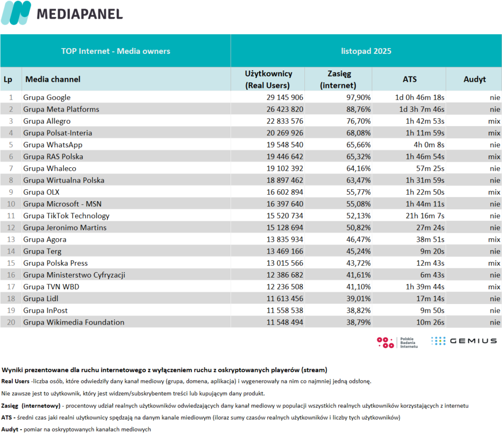 W listopadzie liczba internautów wyniosła 29,7 mln. Średnio dziennie korzystało z tego medium 26,7 mln osób.