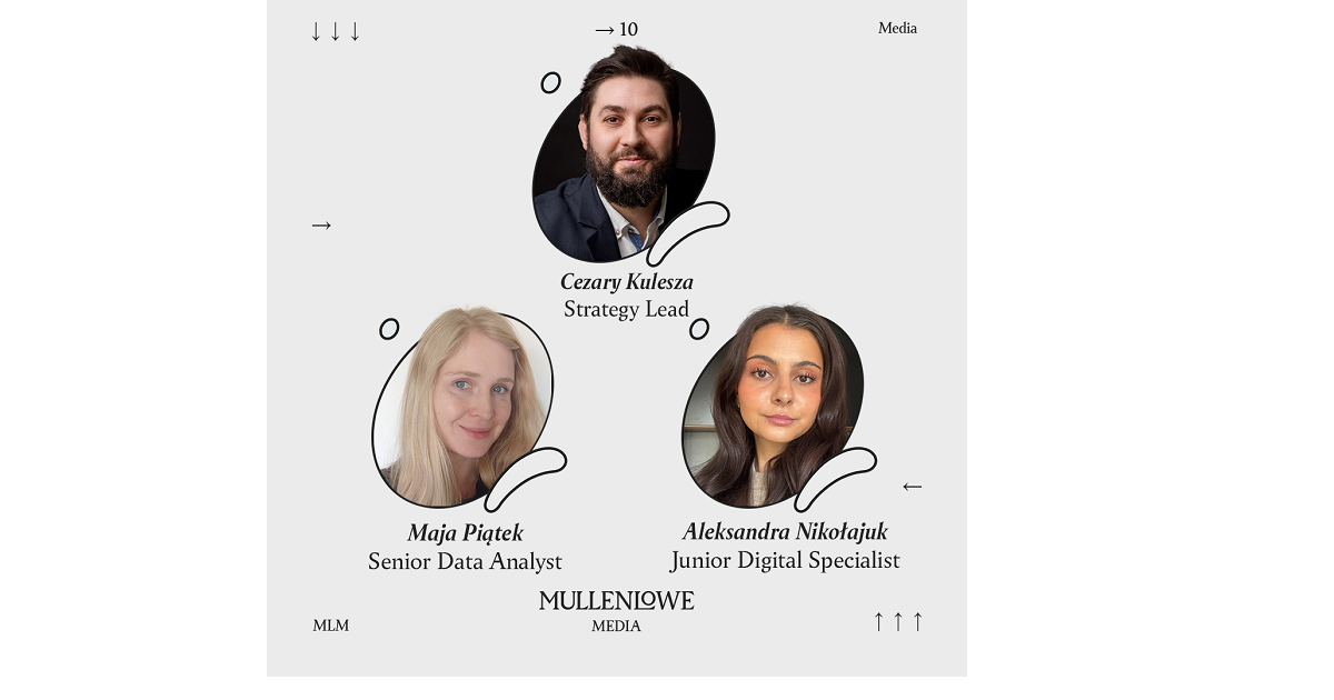 Maja Piątek dołączyła do MullenLowe Media jako senior data analyst. Ma duże doświadczenie analityczne zdobyte w agencji badawczej, u nadawcy telewizyjnego oraz w domach mediowych. Jej kompetencje obejmują zarówno precyzyjną pracę z danymi, jak i wyciąganie wniosków wspierających działania strategiczne. Specjalizuje się w łączeniu analiz ilościowych z biznesową perspektywą klienta.