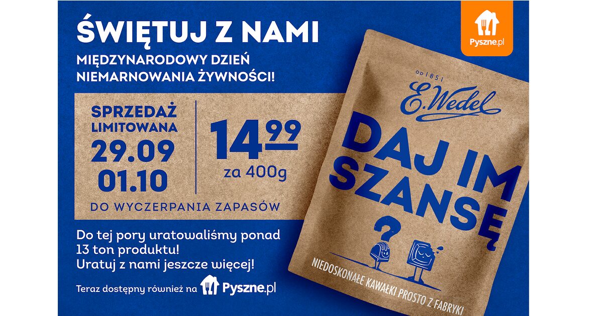 Z okazji Międzynarodowego Dnia Świadomości o Marnowaniu Żywności, E.Wedel i Pyszne.pl przypominają, że jedzenie, które nie wygląda idealnie, wciąż może być absolutnie pyszne. Tylko od 29 września do 1 października (lub do wyczerpania zapasów) w serwisie Pyszne.pl dostępne będą specjalne paczki od E.Wedel – „Daj im szansę”, czyli cieszące się dużym zainteresowaniem zestawy słodyczy, które posiadają lekkie defekty produkcyjne, ale zamiast trafić do utylizacji, otrzymują drugą szansę.
