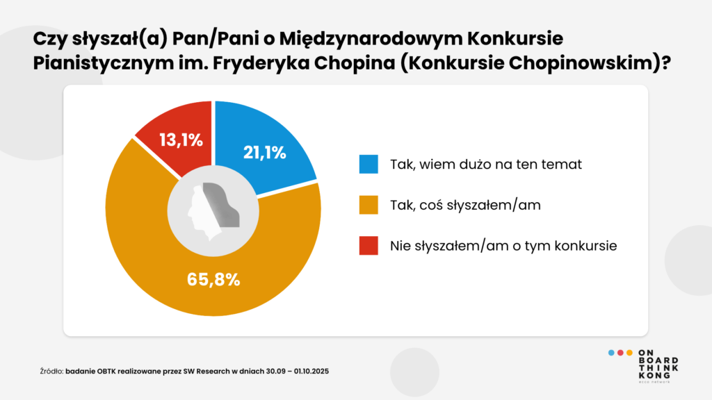 Aż 87% Polaków deklaruje, że słyszało o Międzynarodowym Konkursie Pianistycznym im. Fryderyka Chopina, z czego co piąta osoba (21%) twierdzi, że wie o nim dużo. Zaledwie 13% badanych przyznaje, że nie zna tego wydarzenia.