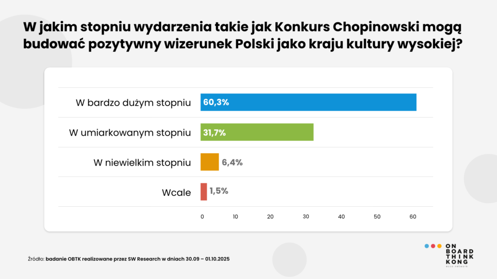 Większość respondentów (60%) uważa, że wydarzenia takie jak Konkurs Chopinowski w bardzo dużym stopniu budują pozytywny wizerunek Polski jako kraju kultury wysokiej. Kolejne 32% dostrzega umiarkowany wpływ, a tylko nieliczni (8%) oceniają go jako niewielki lub żaden.