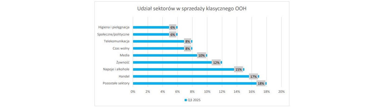 Silny pozostaje sektor handlu, który w trzecim kwartale odpowiadał za największy udział w wydatkach reklamowych w klasycznym OOH. W tym okresie dominowały kampanie promujące produkty szybko zbywalne oraz akcje sprzedażowe w ramach sezonu „back to school”. W końcówce kwartału widoczny był już początek jesiennej aktywności marek odzieżowych i detalicznych, której pełen efekt tradycyjnie pojawia się w czwartym kwartale roku.
