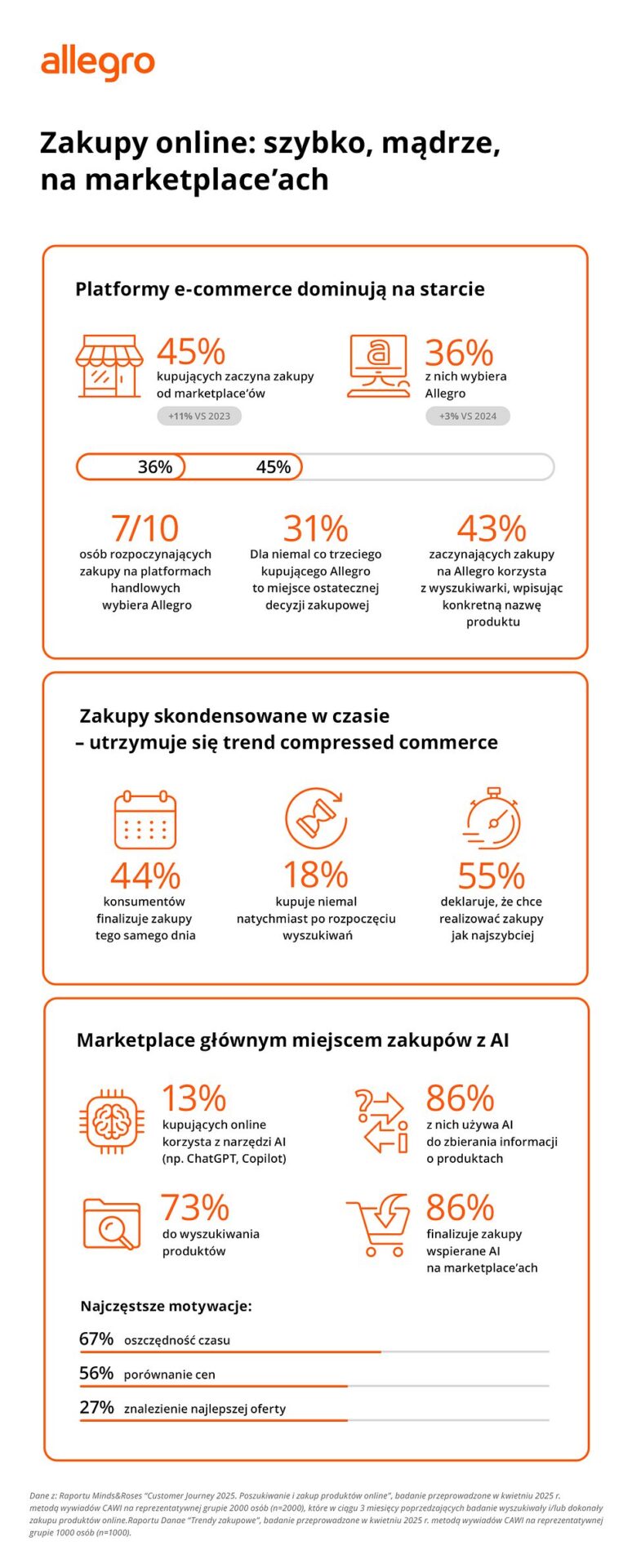 Jak wynika z najnowszego raportu „Customer Journey 2025. Poszukiwanie i zakup produktów online”, przeprowadzonego przez agencję Minds&Roses na zlecenie Allegro, znaczenie platform e-commerce w kontekście ścieżki zakupowej rośnie. Już 45% kupujących zaczyna swoje zakupy od marketplace’ów – to wzrost o 11 p.p. względem 2023 roku. Liderem pozostaje Allegro, które wybiera 7 na 10 osób rozpoczynających zakupy na platformach. Nadal silny jest trend compressed commerce, czyli zakupów maksymalnie skróconych i skondensowanych w jednym miejscu, realizowanych w jak najkrótszym czasie. Aż 44% konsumentów finalizuje transakcję jeszcze tego samego dnia co rozpoczynają poszukiwania, a blisko jedna piąta decyduje się na zakup od razu. Ponad połowa e-klientów oczekuje możliwie szybkich zakupów, a niemal 8 na 10 z nich przyznaje, że w przypadku mało znanych produktów oczekuje pełnych informacji w miejscu zakupu – aby uniknąć konieczności poszukiwania dodatkowych źródeł.