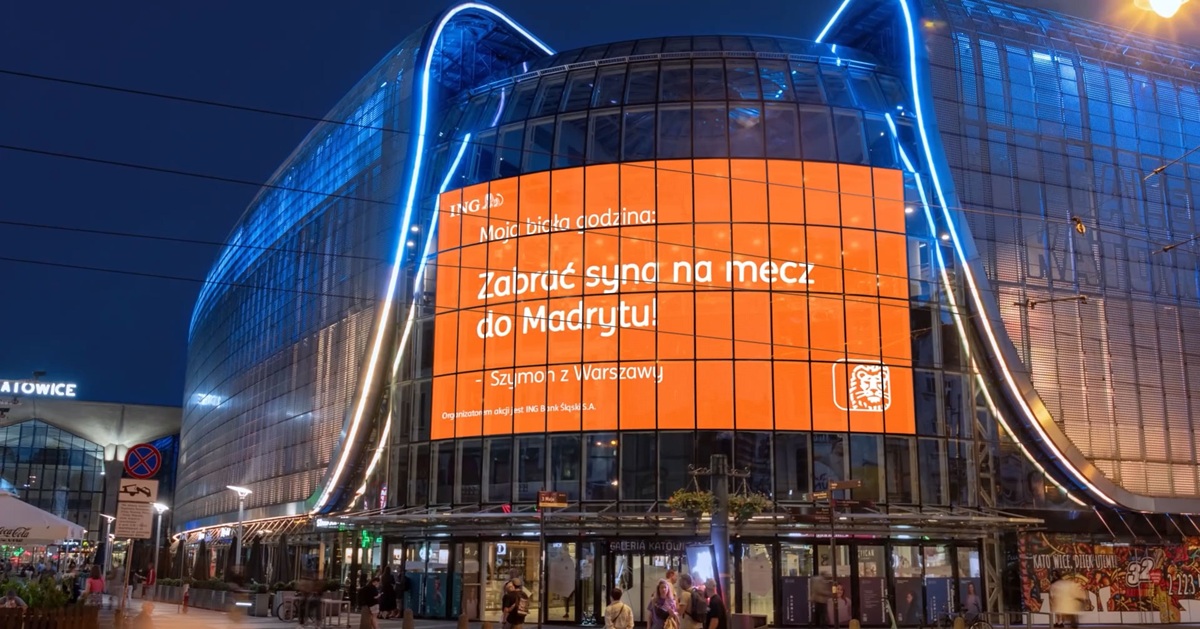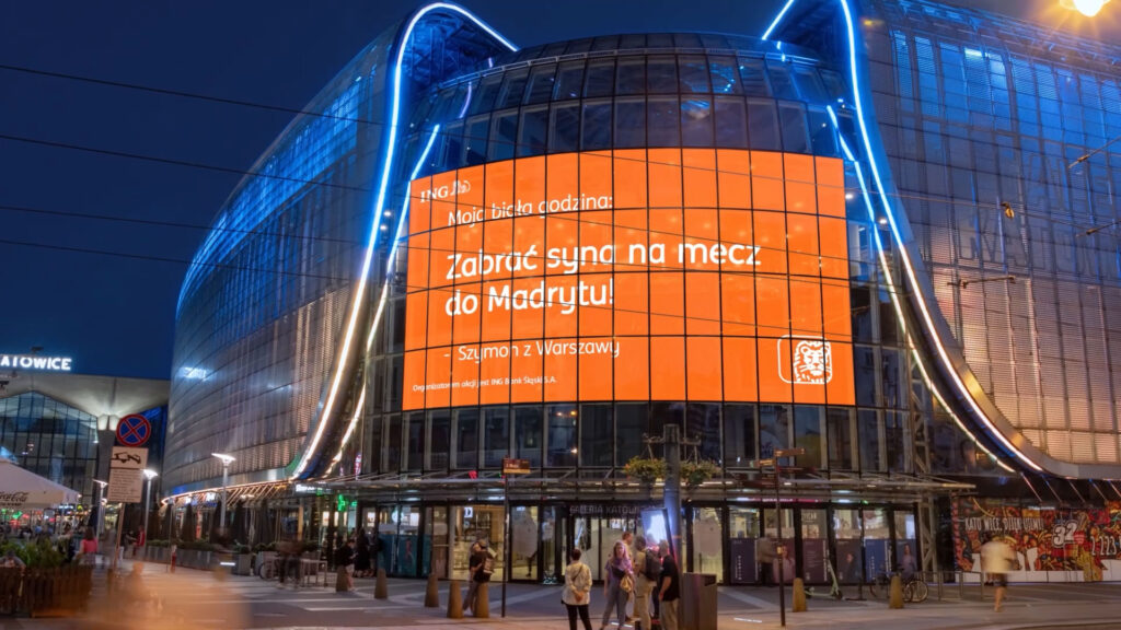 Pierwsza kampania, którą chcę wyróżnić, to działania banku ING. Bank inspirował Polaków do odkładania na „Białą Godzinę” poprzez prawdziwie interaktywną i wielkoformatową akcję. Przechodnie mogli wpisywać swoje marzenia online, a ich cele natychmiast pojawiały się na ogromnych ekranach w Warszawie, Katowicach i Łodzi. Ta natychmiastowa reakcja, tworzyła silny efekt „wow” i budowała emocjonalne zaangażowanie. To doskonale pokazuje, jak można łączyć personalizację, interakcję i storytelling w czasie rzeczywistym, tworząc jednocześnie doświadczenia niemożliwe do odtworzenia w żadnym innym medium.