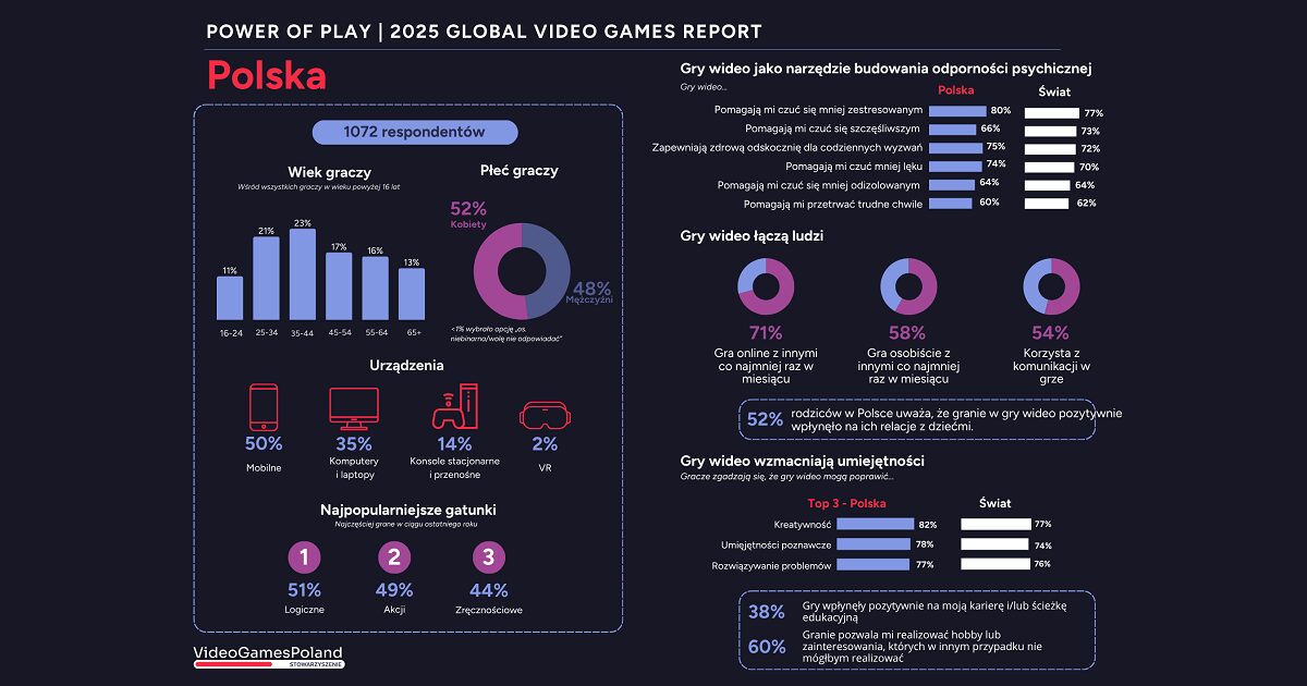 – Jako jedna z najpopularniejszych form rozrywki na świecie, gry wideo są źródłem zabawy i rozrywki dla miliardów graczy. Raport Global Power of Play 2025 potwierdza jednak, że gry wideo to znacznie więcej – mówi Dominika Urbańska-Galanciak, dyrektorka zarządzająca stowarzyszenia Video Games Poland. – Gracze z Polski i całego świata podkreślają, że gry nie tylko pomagają radzić sobie ze stresem i codziennymi wyzwaniami, ale też zwiększają poczucie szczęścia. Jednocześnie rozwijają cenne umiejętności: od kreatywności i zdolności poznawczych, po rozwiązywanie problemów, współpracę oraz budowanie relacji – także pomiędzy rodzicami i dziećmi. Moc gier wykracza daleko poza rozrywkę. Mogą one pełnić istotną rolę w życiu społecznym i w edukacji.