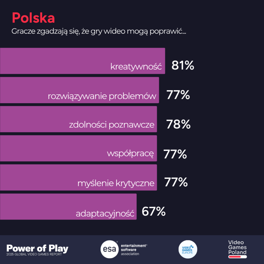 Raport potwierdza też, że granie rozwija konkretne kompetencje, szczególnie te istotne w cyfrowym świecie. Gracze na całym świecie wskazują kreatywność, rozwiązywanie problemów i współpracę jako kluczowe umiejętności rozwijane dzięki grom. W Polsce aż 82% badanych uważa, że gry wspierają ich kreatywność, 78% dostrzega rozwój zdolności poznawczych, a 77% – lepszą umiejętność pracy zespołowej. Dla wielu graczy to nie tylko hobby, ale również źródło inspiracji, które przekłada się na naukę i pracę zawodową. Co istotne, dla części graczy rozwój ten przekłada się również na życie zawodowe i naukę. 45% Polaków przyznaje, że granie miało pozytywny wpływ na ich karierę lub edukację, a ponad połowa graczy globalnie (56%) wskazuje, że gry pomagają im uczyć się nowych rzeczy i rozwijać kompetencje przydatne w pracy.