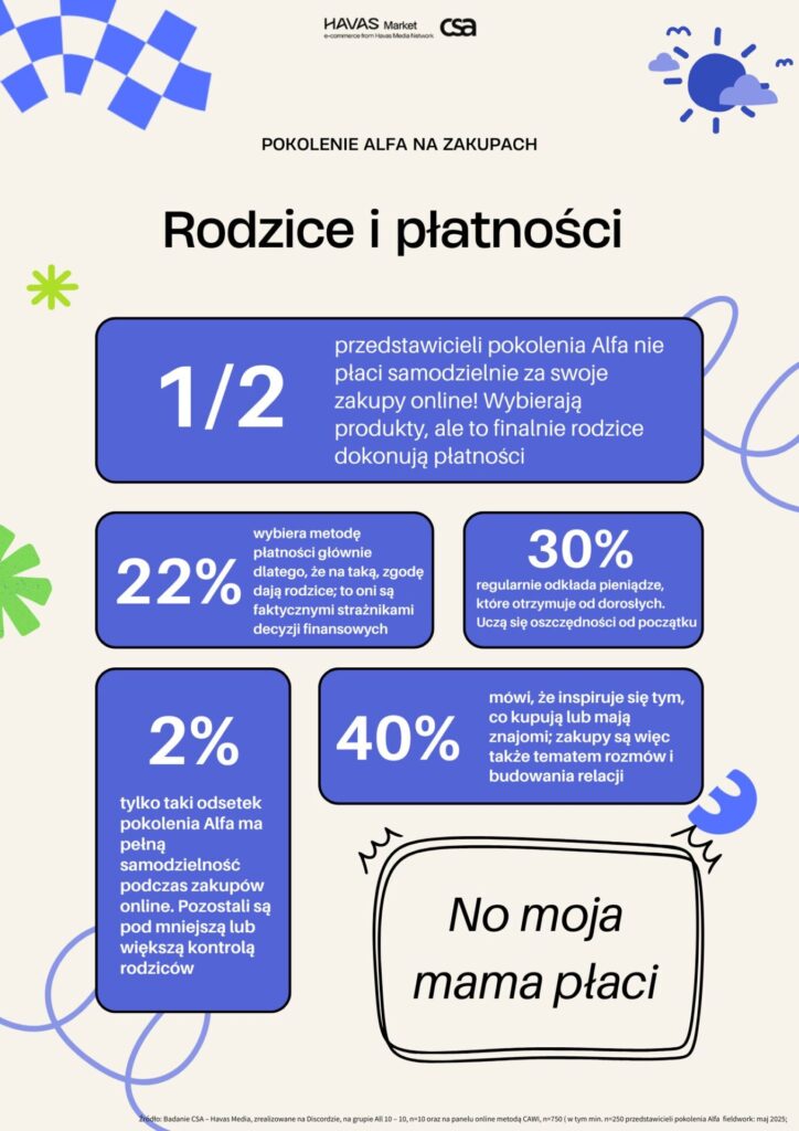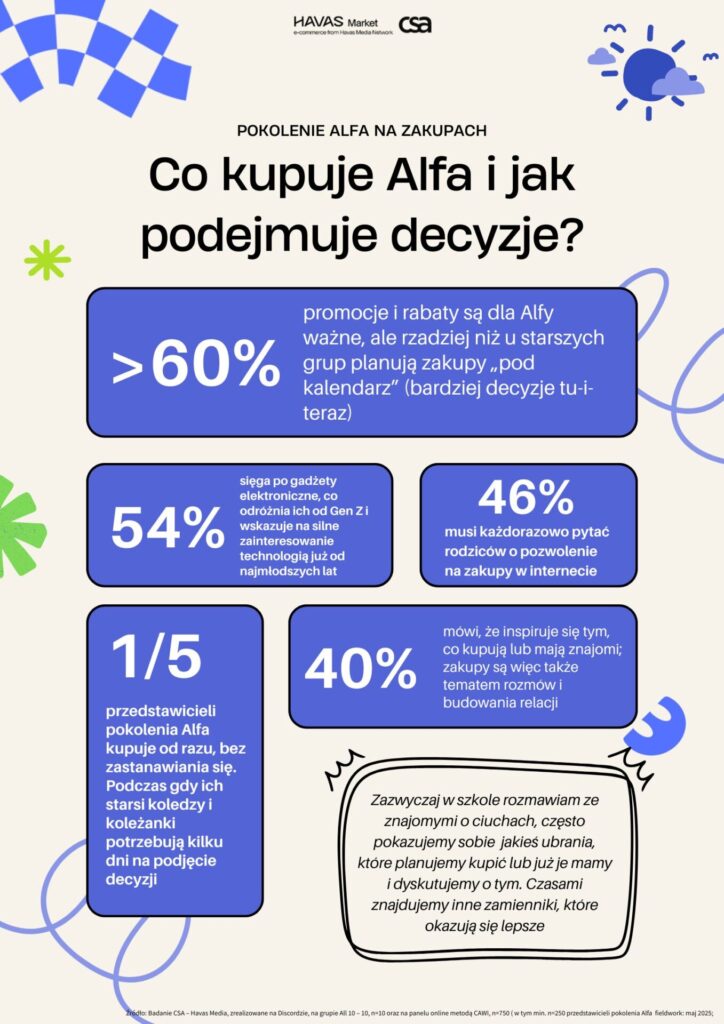 Pokolenie Alfa to dzieci urodzone po 2010 roku – pierwsza generacja całkowicie wychowana w erze cyfrowej. Dla nich świat online to nie dodatek do codzienności, lecz jej naturalne przedłużenie. To młodzi użytkownicy internetu, którzy już dziś wpływają na decyzje zakupowe swoich rodzin, a w niedalekiej przyszłości staną się pełnoprawnymi konsumentami. Wyróżniają się wysoką biegłością technologiczną, szybkim przyswajaniem nowych trendów i silną potrzebą personalizacji. Ich wybory, sposób poruszania się po świecie e-commerce i oczekiwania względem marek mogą diametralnie różnić się od starszych grup wiekowych – również tej najbliższej, czyli generacji Z. Dlatego zespół badaczy CSA wraz z Havas Market, wyspecjalizowaną w e-commerce i performance media jednostką Havas Media Network, postanowił przyjrzeć się z bliska ich zwyczajom zakupowym online, aby zrozumieć, co ich przyciąga, jak podejmują decyzje, gdzie i jak kupują oraz jak widzą przyszłość zakupów online. Bo choć są jeszcze bardzo młodzi – ich głos zaczyna realnie kształtować przyszłość rynku.