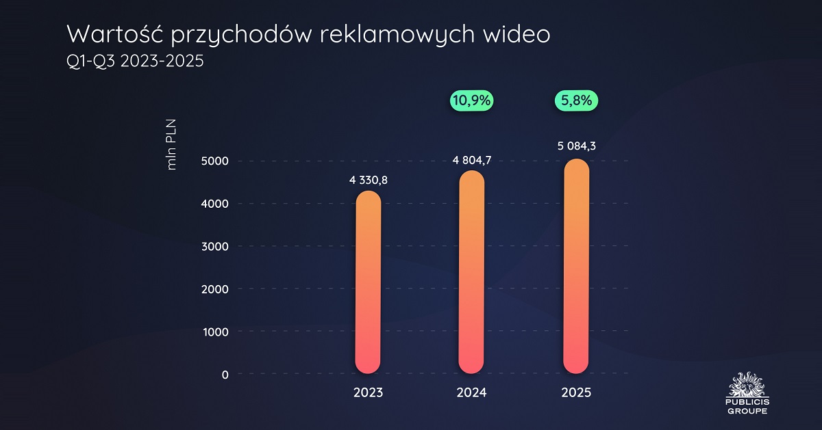 Rynek reklamy wideo, obejmujący telewizję i wideo online, wzrósł w pierwszych trzech kwartałach 2025 r. o 5,8% w porównaniu do analogicznego okresu w 2024 roku, a jego wartość wyniosła niespełna 5,1 miliarda zł, wynika z analizy Publicis Groupe Polska.