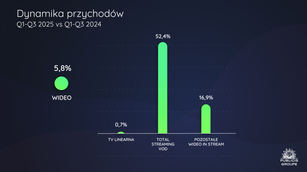 Udział wideo online przekroczył 30% w pierwszych trzech kwartałach 2025 r., zaś dynamika wzrostu przychodów wyniosła ponad 19% rok do roku. Segment total streaming (serwisy video on demand: BVOD, HVOD i pozostałe VOD) pod kątem przychodów wzrósł o 52,4% od stycznia do września 2025 roku, jednak w analogicznym okresie 2024 r. rozwój kanałów FAST oraz platformy MAX (obecnie HBO Max) dopiero nabierał tempa.