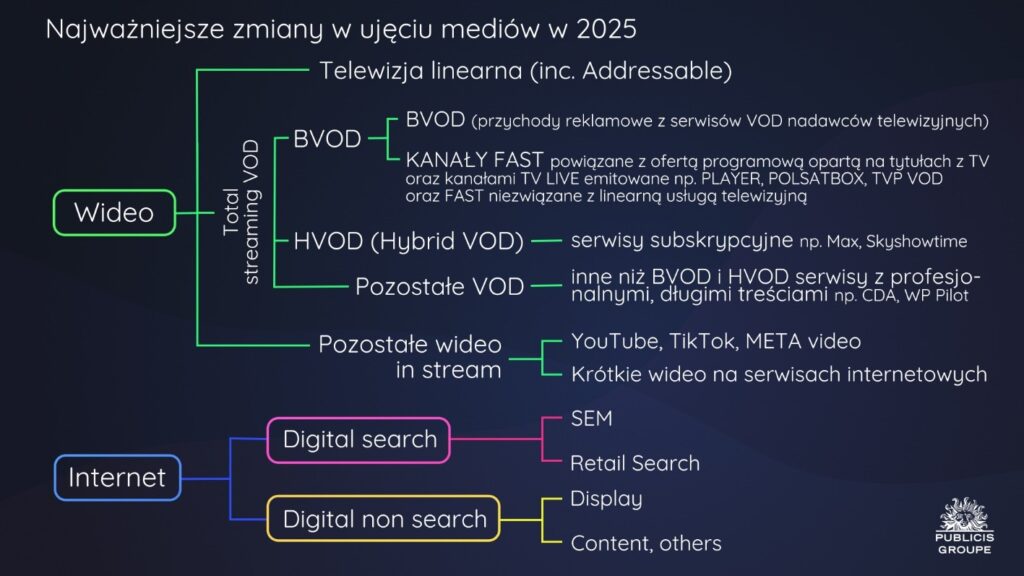 *Publicis Groupe wprowadziła łączne podejście do monitoringu rynku wideo wraz z pierwszą edycją Raportu o Rynku reklamy w 2024 r. Wprowadzone w pierwszym kwartale pojęcie 'wideo’, obejmuje zarówno telewizję, jak i wideo online. Dotychczasowe sklasyfikowanie wideo online do kategorii internet stało się nieaktualne w dobie smart TV i CTV, gdzie granice pomiędzy tradycyjną telewizją a konsumowaniem treści wideo online zacierają się. Biorąc pod uwagę szybko zmieniającą się sytuację na rynku wideo, a także głosy z tego rynku, przeprowadzony został kolejny przegląd kategoryzacji w obrębie segmentu streamingu VOD.