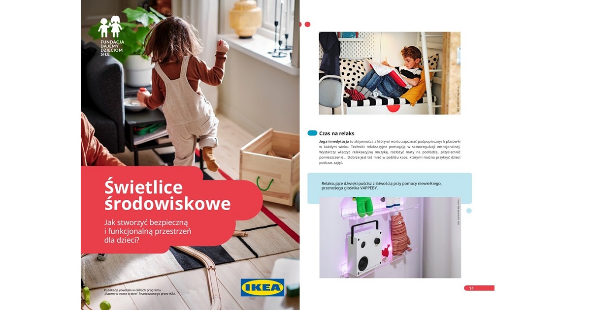 Poradnik „Zasady bezpiecznych relacji w placówkach wsparcie dziennego” wraz z rozdziałem IKEA o bezpiecznych i funkcjonalnych przestrzeniach dla dzieci dostępny jest na stronie Fundacji Dajemy Dzieciom Siłę pod linkiem: zasady-bezpiecznych-relacji-w-placowkach-wsparcia-dziennego-krotki-przewodnik-dla-kadry-pdf-1760777104-1-37.pdf.