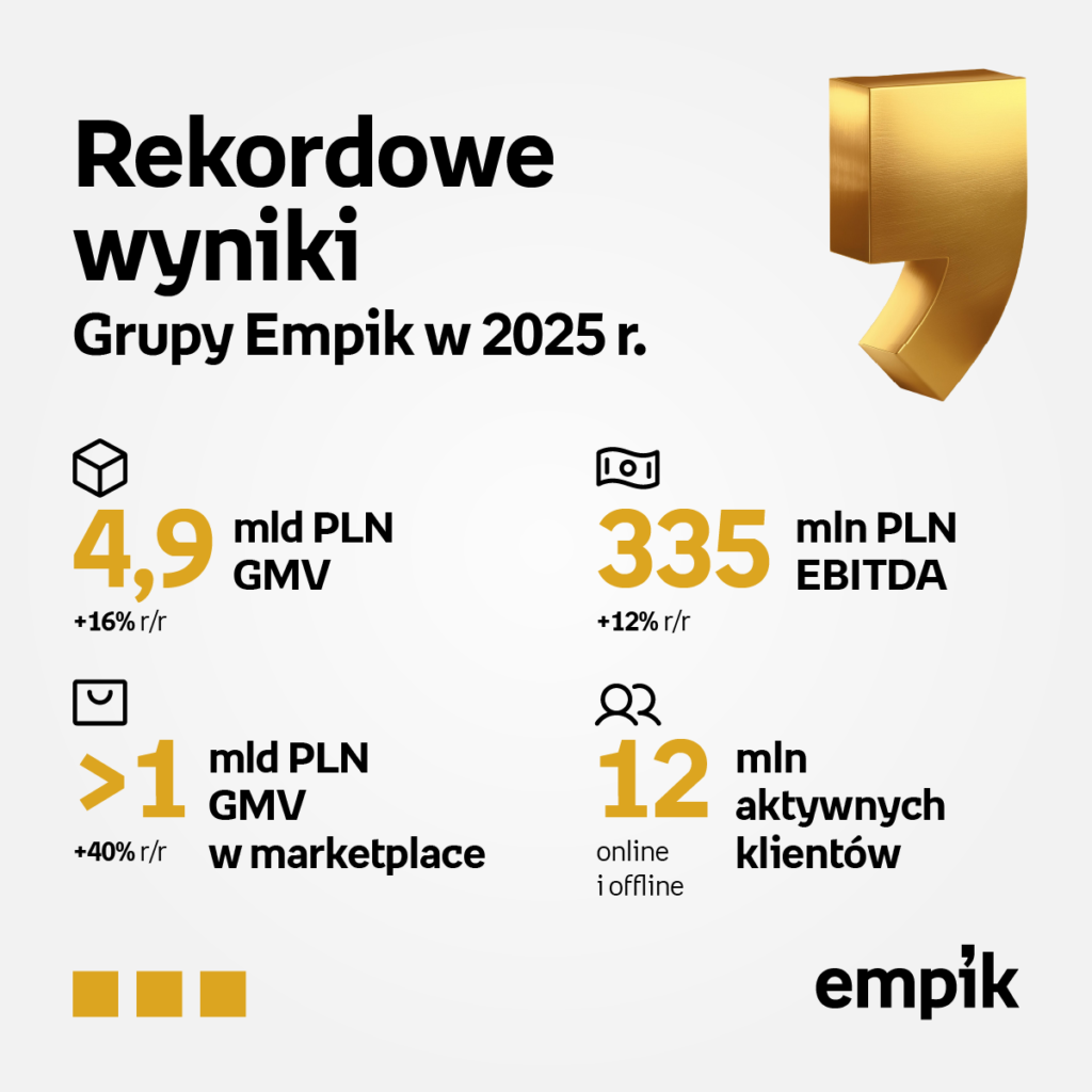 Kolejny rok z rzędu Grupa Empik odnotowała rekordowe wyniki sprzedaży. W 2025 r. całkowita wartość GMV zwiększyła się o 16 proc. r/r, osiągając poziom blisko 4,9 mld zł. Utrzymujący się trend dwucyfrowej dynamiki wzrostu oraz poprawa rentowności Grupy w stosunku do poprzedniego roku do poziomu 335 mln zł EBITDA potwierdzają efektywność realizowanej od lat strategii rozwoju. Stabilny rozwój Grupy to bezpośredni efekt systematycznej rozbudowy oferty produktowej w obszarze lifestyle & leisure, dynamicznego rozwoju marketplace, który w 2025 roku wygenerował ponad 1 mld zł GMV, synergii kanałów online i offline oraz rosnącej bazy już ponad 12 mln klientów, z których połowa korzysta z aplikacji lub programu Empik Premium.
