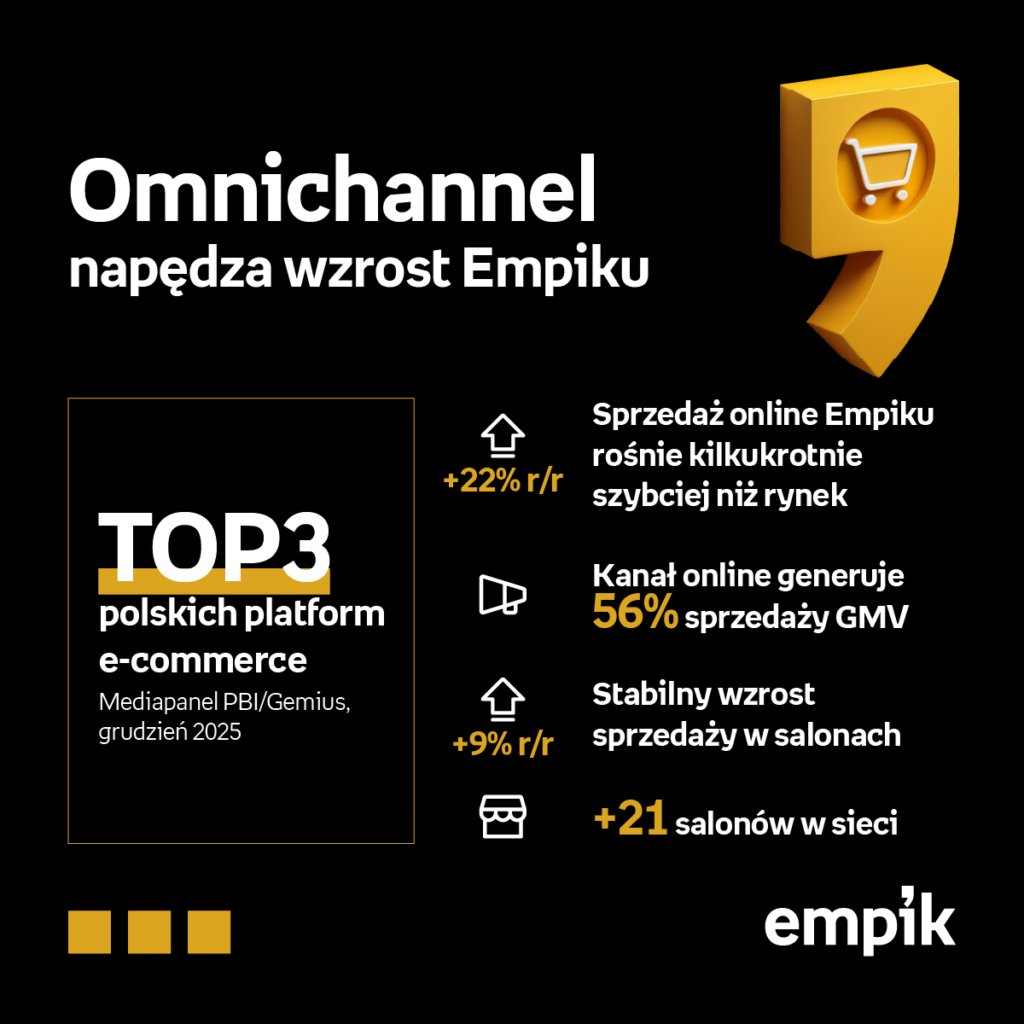 Fundamentem efektywności operacyjnej Grupy Empik jest model omnichannel, łączący sieć 386 salonów stacjonarnych z dynamicznie rozwijającym się kanałem online, który wygenerował w 2025 roku już 56 proc. GMV. Całkowita sprzedaż internetowa wzrosła w 2025 roku o 22 proc. r/r, co wyróżnia się na tle rynku, a najszybsze tempo wzrostu odnotował marketplace (+40 proc. r/r). Skala i dynamika wzrostu pozwalają Empikowi umacniać pozycję w TOP 3 polskich platform e-commerce pod względem liczby realnych użytkowników (Mediapanel , grudzień 2025).