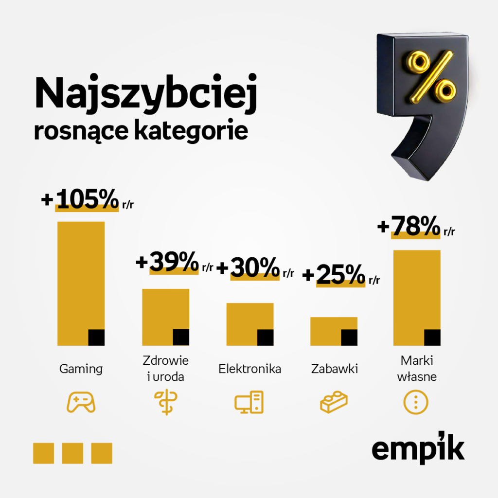 Empik konsekwentnie rozwija swoją ofertę, poszerzając sprzedaż poza podstawowymi segmentami. W 2025 roku Grupa odnotowała wzrosty w takich kategoriach jak zabawki (+25 proc. r/r), dom i ogród (+19 proc. r/r), elektronika (+30 proc. r/r), sport (+23 proc. r/r) oraz zdrowie i uroda (+39 proc. r/r). Największą dynamikę odnotowano w kategorii gaming, która wyniosła 105 proc. r/r.