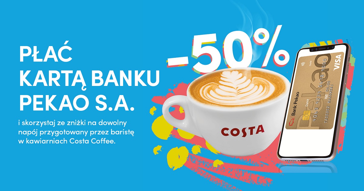 Od października wszyscy klienci indywidualni Pekao mogą skorzystać z wyjątkowej promocji i dzięki otrzymanej zniżce, płacąc kartą banku, cieszyć się ulubioną kawą za jedynie połowę ceny w kawiarniach Costa Coffee. Akcja obejmuje ponad 100 kawiarni Costa Coffee w dużych miastach Polski, a jej partnerem jest Visa, jeden ze światowych liderów płatności cyfrowych.