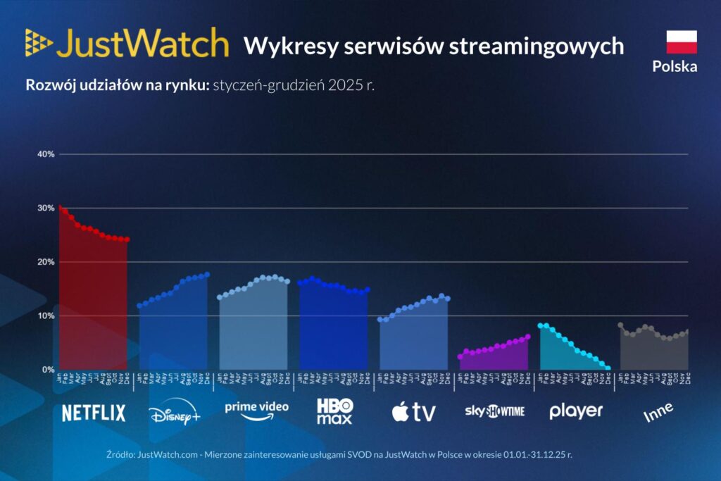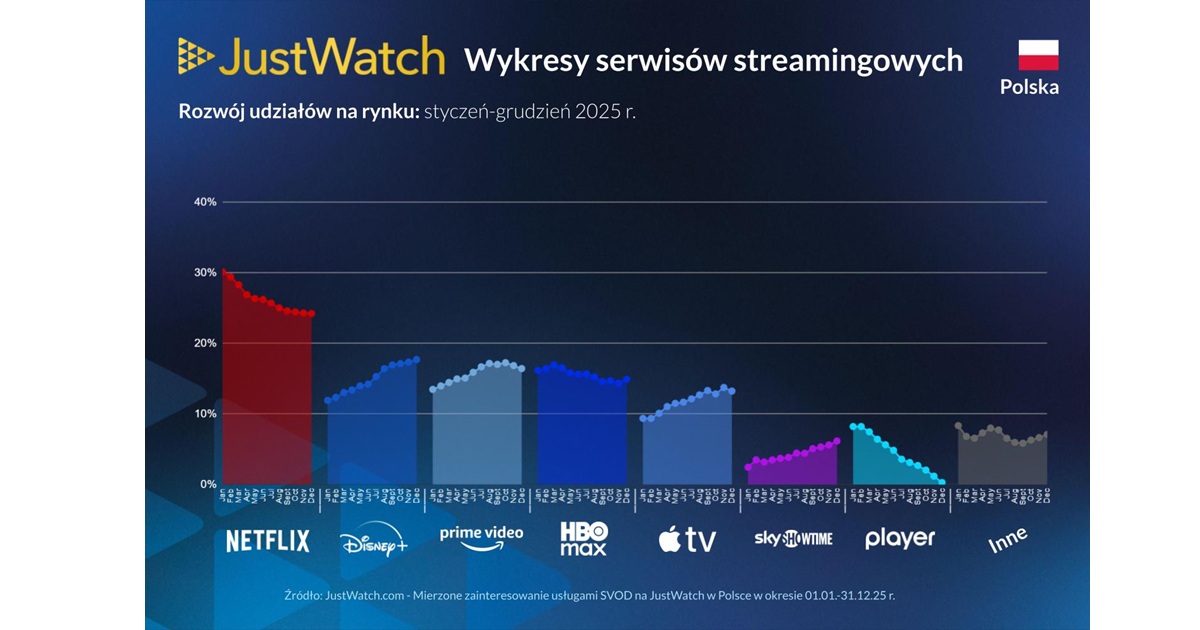 JustWatch opublikował najnowszy raport dotyczący polskiego rynku streamingowego, analizując zmiany zachodzące w 2025 roku. Z około 700 000 miesięcznych użytkowników w Polsce, JustWatch dostarcza unikalnych informacji na temat nawyków widzów online.