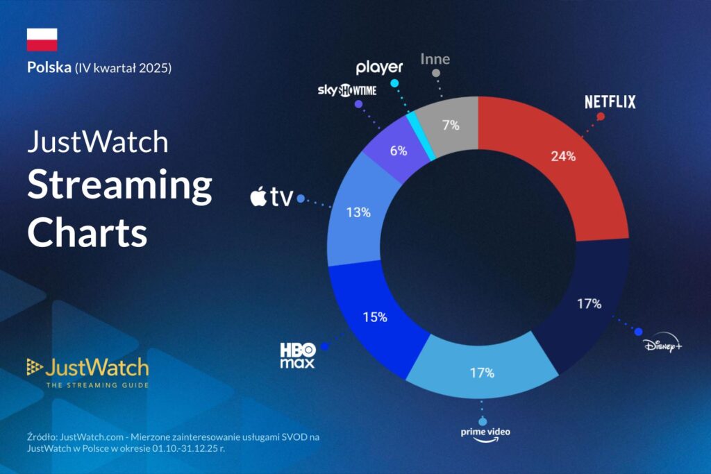 - Stabilność Głównych Konkurentów: HBO Max (15%) i Apple TV+ (13%) utrzymały stabilne udziały rynkowe w Q4 2025.