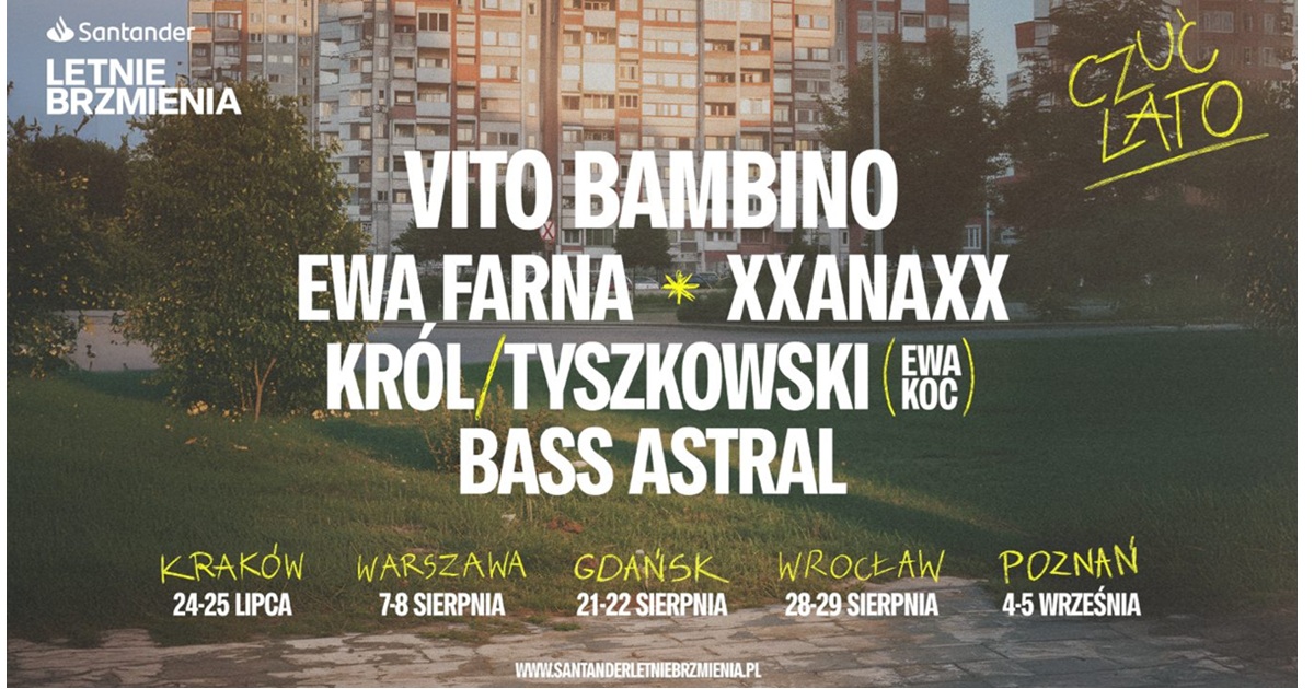 To jeszcze nie lato, ale już teraz można zacząć planować jego najlepsze momenty! Santander Letnie Brzmienia – jeden z największych muzycznych projektów w Polsce – zdradza pierwsze konkrety na nadchodzący rok. Znamy miasta, daty i trasy, a także pierwszych artystów, którzy zagrają na każdym z pięciu przystanków: wśród nich m.in. Vito Bambino, Ewa Farna czy powracający zespół Xxanaxx! Do sprzedaży na www.santanderletniebrzmienia.pl trafiła też pierwsza pula biletów i karnetów. Czy w ten zimowy dzień już czuć lato?