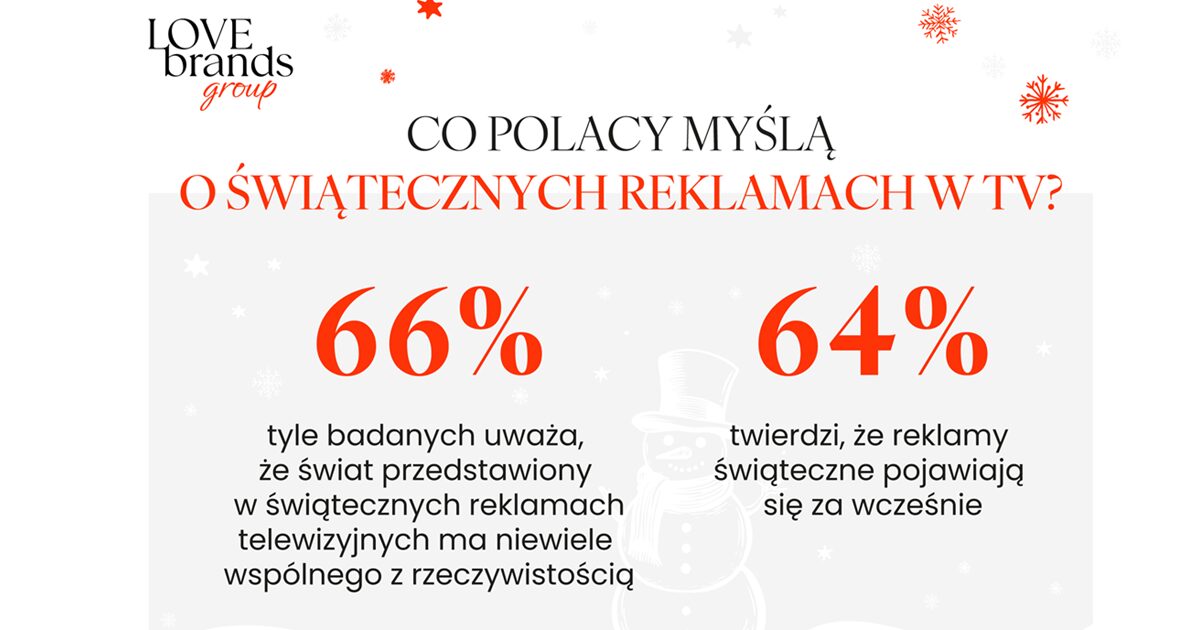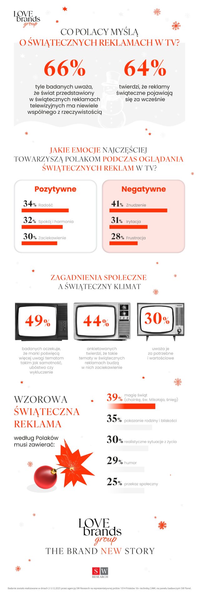 Aż dwie trzecie Polaków (66%) uważa, że świat przedstawiony w świątecznych reklamach telewizyjnych ma niewiele wspólnego z rzeczywistością, a blisko 1/3 z nich reklamy świąteczne wręcz irytują! Tak przynajmniej wynika z najnowszego badania SW Research i LoveBrands Group, w którym zapytano Polaków o to, jaki jest ich stosunek do komunikacji marek w okresie przedświątecznym.