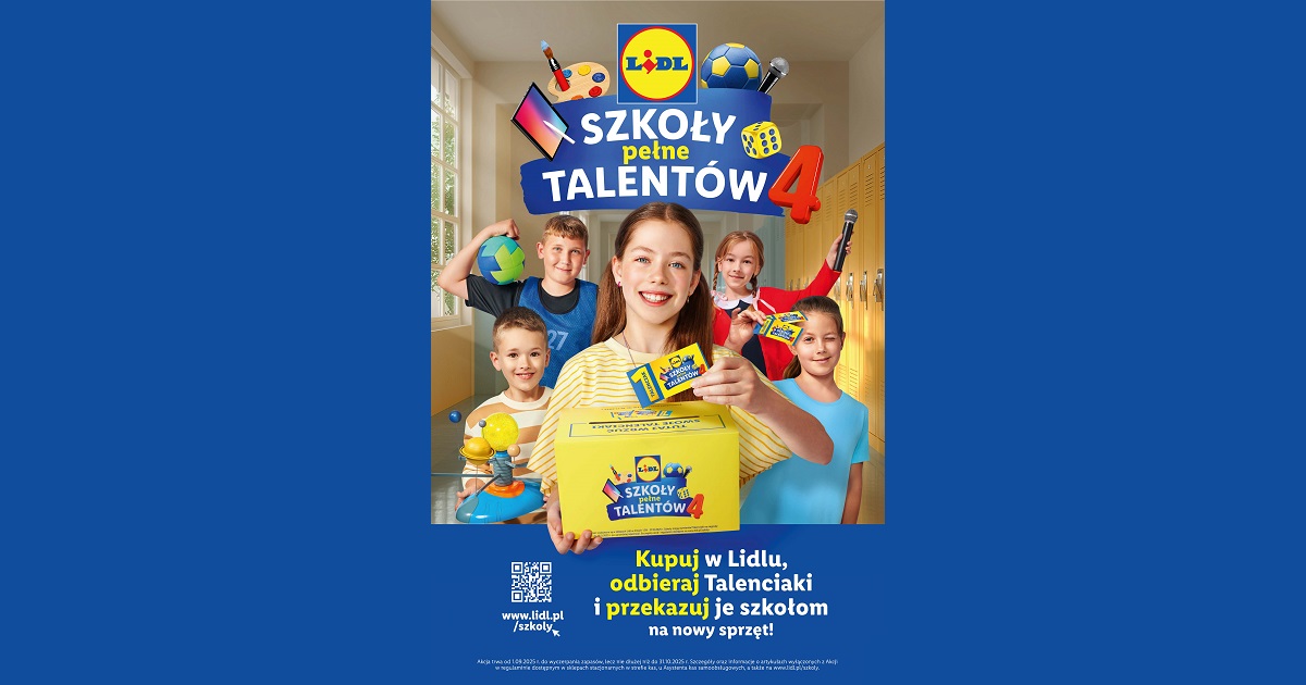 Akcja „Szkoły Pełne Talentów” pozwala szkołom z całego kraju zdobywać nowoczesny sprzęt edukacyjny. Klienci sieci, robiąc zakupy za minimum 50 zł i kupując przynajmniej jeden owoc lub warzywo, otrzymują Talenciaki – specjalne vouchery, które mogą przekazać wybranej placówce, skanując kod QR, wpisując go online na stronie www.lidl.pl/szkoly albo wrzucając Talenciaka do pudełka w szkole.