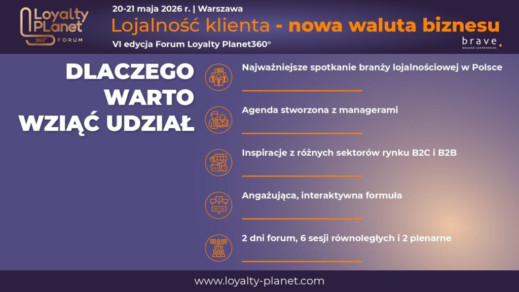 Odpowiedzią na te zmiany jest VI edycja Forum Loyalty Planet360° – wiodącego wydarzenia w Polsce poświęconego lojalności, retencji i budowaniu relacji z klientami. Forum odbędzie się 20–21 maja 2026 r. w Warszawie i po raz kolejny stanie się przestrzenią wymiany doświadczeń, inspiracji oraz sprawdzonych praktyk rynkowych. Tegoroczna edycja realizowana jest pod hasłem „Lojalność klienta – nowa waluta biznesu”, podkreślając rosnącą rolę zaangażowania i długofalowych relacji jako kluczowych czynników przewagi konkurencyjnej firm.