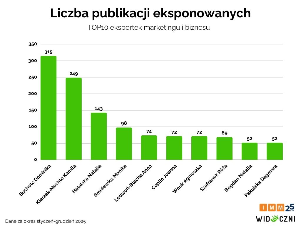 W wyniku współpracy IMM i Widocznych powstało zestawienie ekspertek, które aktywnie i regularnie dzielą się wiedzą z obszaru marketingu i biznesu, a ich marki osobiste są silnie widoczne w branżowych mediach.