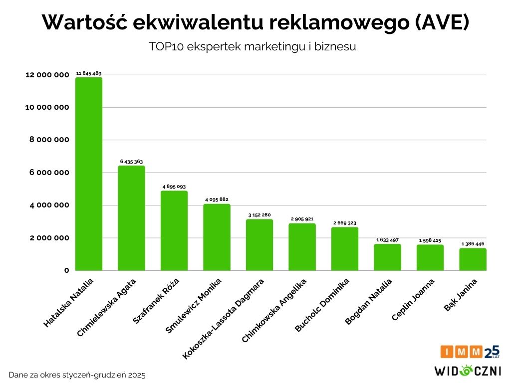 Natalia Hatalska jest także liderką zestawienia uwzględniającego wartość ekspozycji w mediach (AVE), który w jej przypadku został oszacowany na blisko 12 mln zł. Na drugiej pozycji w tym zestawieniu uplasowała się Agata Chmielewska, e-commerce & UX Consultantka, z wynikiem ponad 6,4 mln zł, a trzecia pozycja należy do Róży Szafranek, założycielki agencji HR Hints (blisko 5 mln zł).