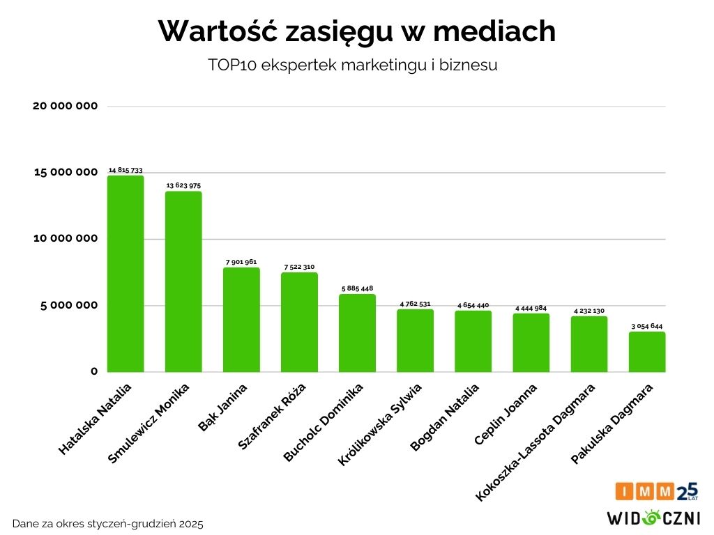 Największym zasięgiem w mediach może poszczycić się Natalia Hatalska. W jej przypadku liczba potencjalnych kontaktów z przekazem mediowym wyniosła ponad 14,8 mln, co oznacza, że statystyczna osoba powyżej 15 roku życia mogła zetknąć się w ciągu minionego roku z informacjami ją przywołującymi średnio 2 razy. Druga pozycja należy do Moniki Smulewicz (ponad 13,6 mln). Trzecie miejsce zajęła Janina Bąk, statystyczka, autorka książek i twórczyni bloga Janina Daily (blisko 8 mln).