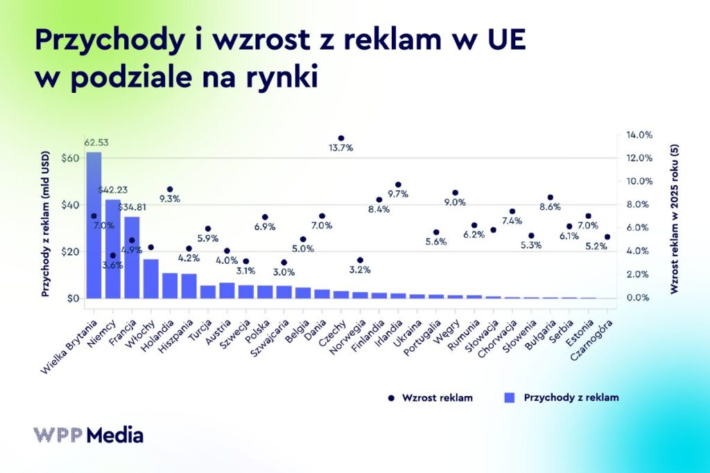 Europejski rynek reklamowy również odnotowuje solidne wzrosty – WPP Media prognozuje, że w 2025 r. zwiększy się o 5,8% do 257,6 mld dol., a w 2026 r. nastąpi dalszy wzrost o 5,5%. W latach 2025–2030 wśród najszybciej rosnących kanałów znajdą się: gaming (18,4% CAGR, skumulowana roczna stopa wzrostu), retail media (12,2% CAGR) oraz streaming (14,8% CAGR). Penetracja reklamy czysto cyfrowej (digital pure-play) wykazuje znaczną zmienność w Europie: 24 z 30 rynków plasuje się poniżej średniej regionalnej wynoszącej 67,2% całkowitych przychodów z reklamy. Ta rozbieżność wynika w dużej mierze z silniejszej obecności mediów tradycyjnych, szczególnie telewizji i prasy, w niektórych regionach, zwłaszcza w Europie Środkowo-Wschodniej. Rynek jest silnie skoncentrowany, gdyż Google, Meta, Amazon, Microsoft i TikTok łącznie mają szacunkowo 77,0% całkowitych przychodów z reklamy cyfrowej w Europie w 2025 r. Ukraina, Czechy i Irlandia są przewidywane jako najszybciej rosnące rynki reklamowe w Europie, Polska również jest w gronie „prymusów”.