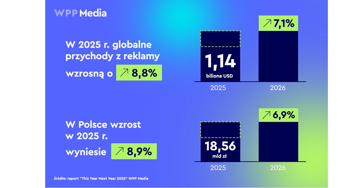 WPP Media w swoim cyklicznym raporcie podsumowującym mijający rok i prognozującym trendy na kolejny, opublikowało najnowsze prognozy dla światowych rynków reklamowych. Według „This Year Next Year, 2025 global end-of-year forecast” dynamika globalnego rynku reklamowego w 2025 roku to aż 8,8% (bez uwzględniania wydatków na reklamę polityczną w USA). Polski rynek rósł w bardzo podobnym tempie, WPP Media oszacowała dynamikę wzrostu w naszym kraju w 2025 r. na 8,9%. Wartość polskiego rynku reklamowego na koniec 2025 r. ma wynieść 18,56 mld zł. Prognozy na kolejny rok zakładają wzrost o kolejne 6,9%.