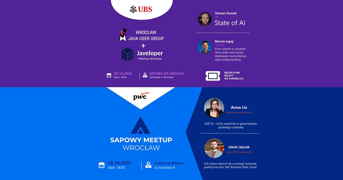 Natomiast 29 października 2025 roku, również w „Sztuka na Miejscu”, odbędzie się WrocławJUG + Javeloper Meetup Wrocław – spotkanie skierowane do społeczności Java, Cloud, AI i Big Data. Zaplanowano m.in. wykład „State of AI” oraz „From words to wisdom: How LLMs and vector databases revolutionize data understanding”. Wydarzenie jest bezpłatne, ale wymaga rejestracji. Bilety znajdziesz tutaj: evenea.pl/pl/wydarzenie/wjugjaveloper